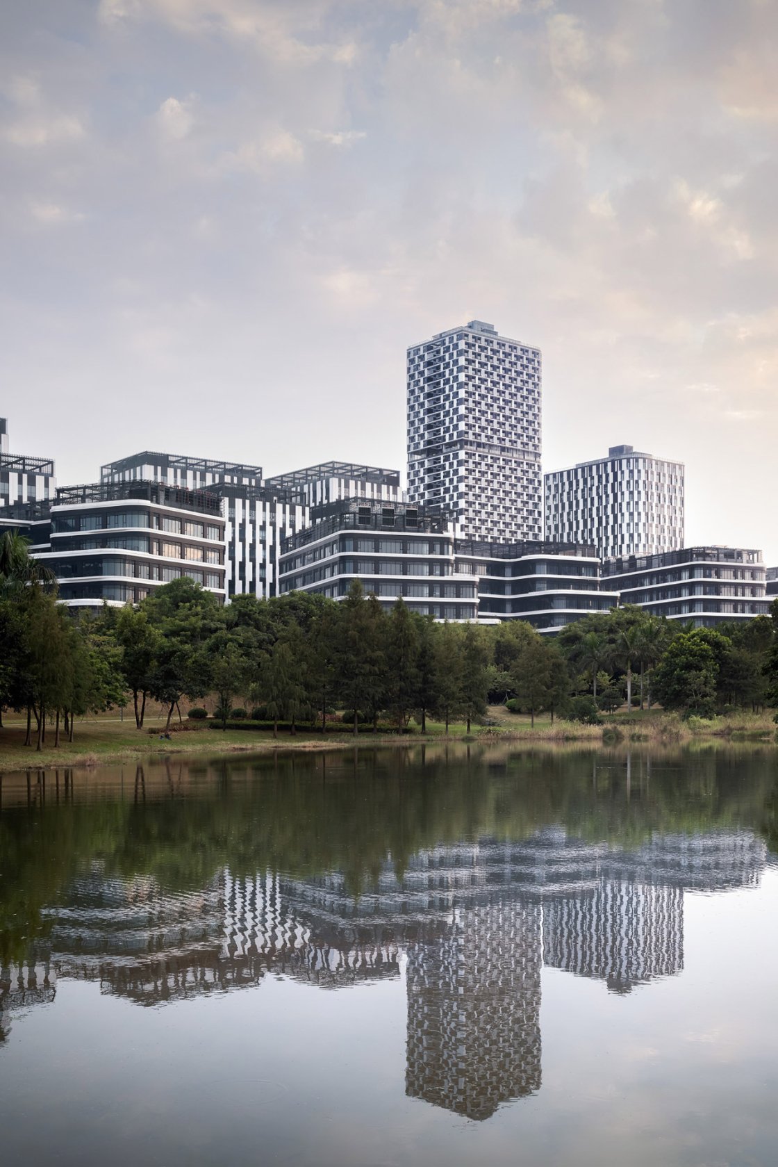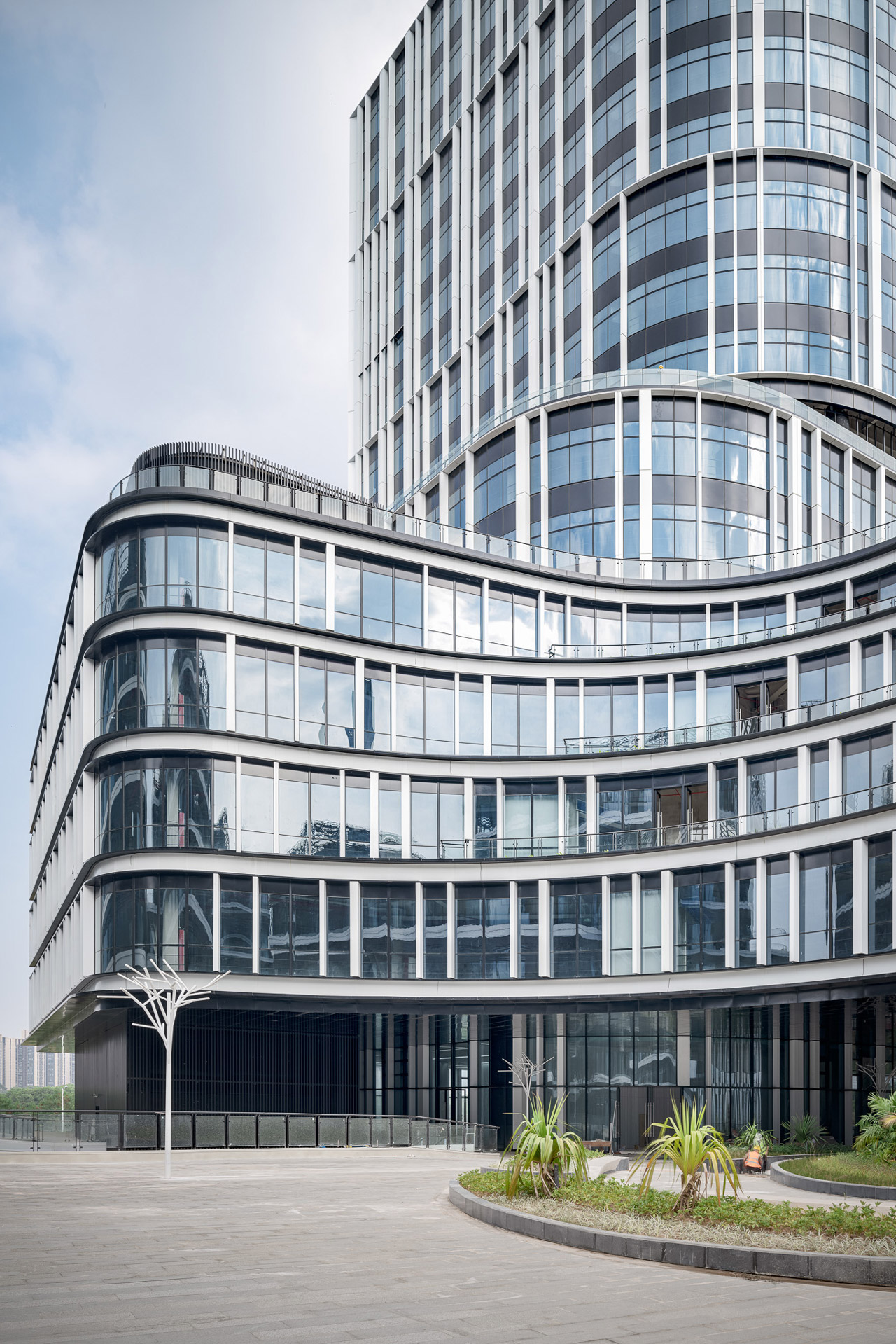 三座醒目的高层建筑其高度分别为100米、154米和200米,它们朝着城市的方向耸立着;除此之外那些较低矮的不规则形状的建筑则面朝公园方向。从最北端高达200米的塔楼到中等高度的建筑,再到开放的公园,通过阶梯化设计,使得过渡非常的流畅。