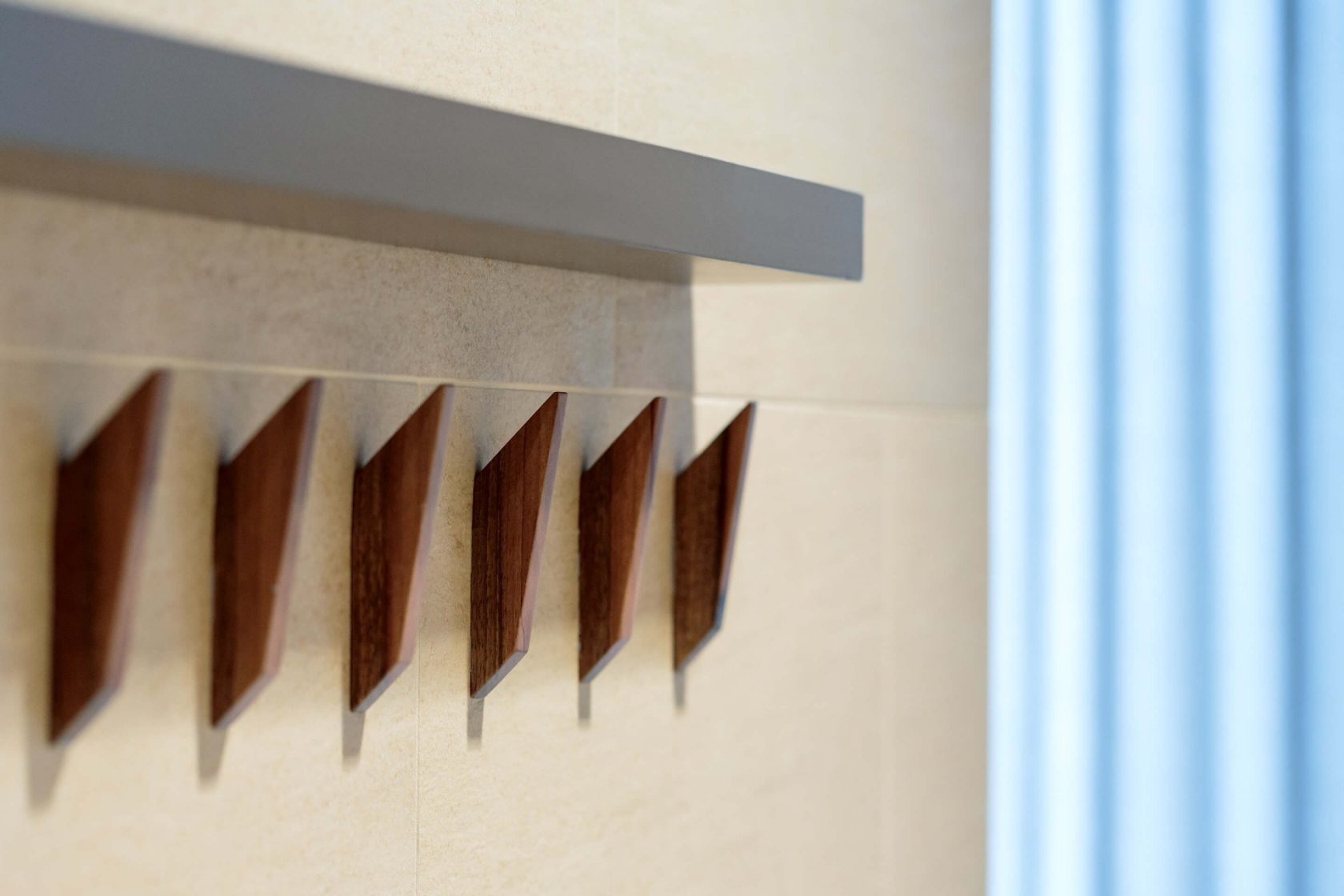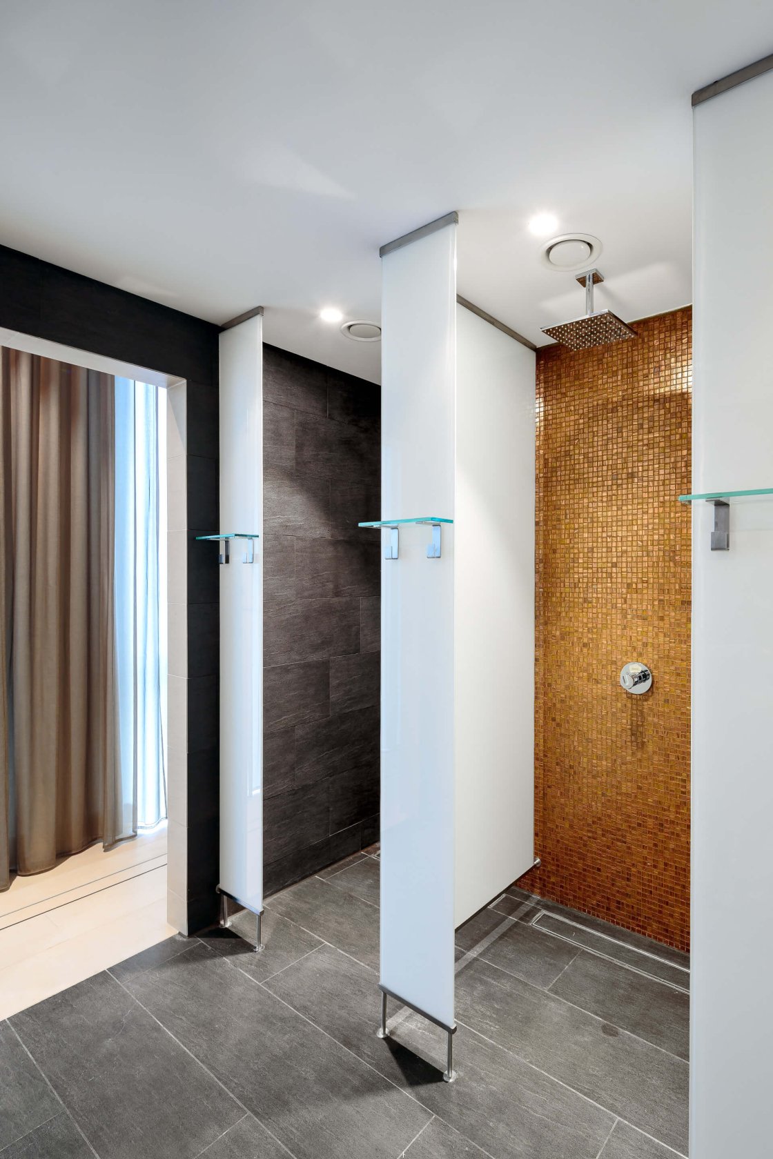 带有咖啡吧的入口区、带有白色可丽耐人造石登记箱的接待台和带有天然植物的“绿墙”是典型的设计元素。更衣室的内部细节更是经过了精心设计,如定制的窗帘、淋浴间的玻璃马赛克、木制毛巾钩和柔和的照明,都给人留下深刻的印象。阁楼式的训练区和铺有实木地板的教室也营造出宜人的氛围。遵循瑞士健身房的整体方案,我们还设计了休息和放松的空间:桑拿浴室、蒸汽浴室、放松水池、Rhassoul泥疗和按摩室。会员和日常客人可以在这里做短暂的休息。
