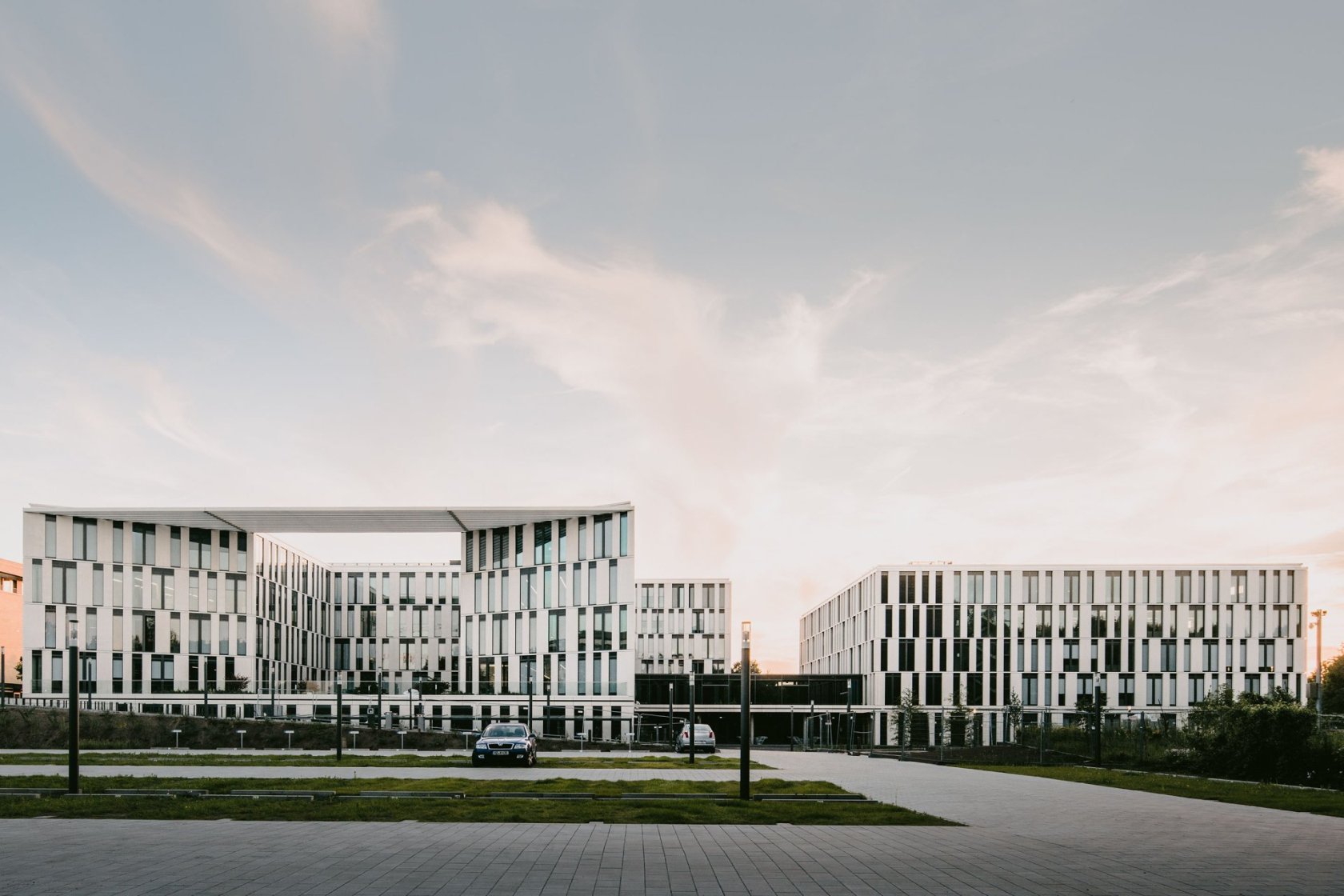 我们将设计分为三个建筑体量,它们通过一个两层高的入口大厅相互连接。在形式上,立方体形状的亭院建筑在波茨坦火车站附近的城市街区和河谷的开阔景观之间起到了过渡作用。另一个特点是:所有三座建筑都有一个内部庭院,而且都有一侧面向自然景观。这些“通往河谷景观的窗户”将自然环境融入到建筑之中,为办公室提供了美丽的景色。