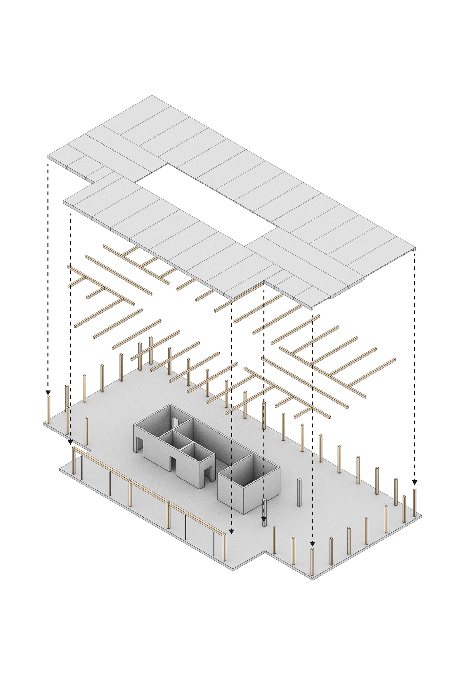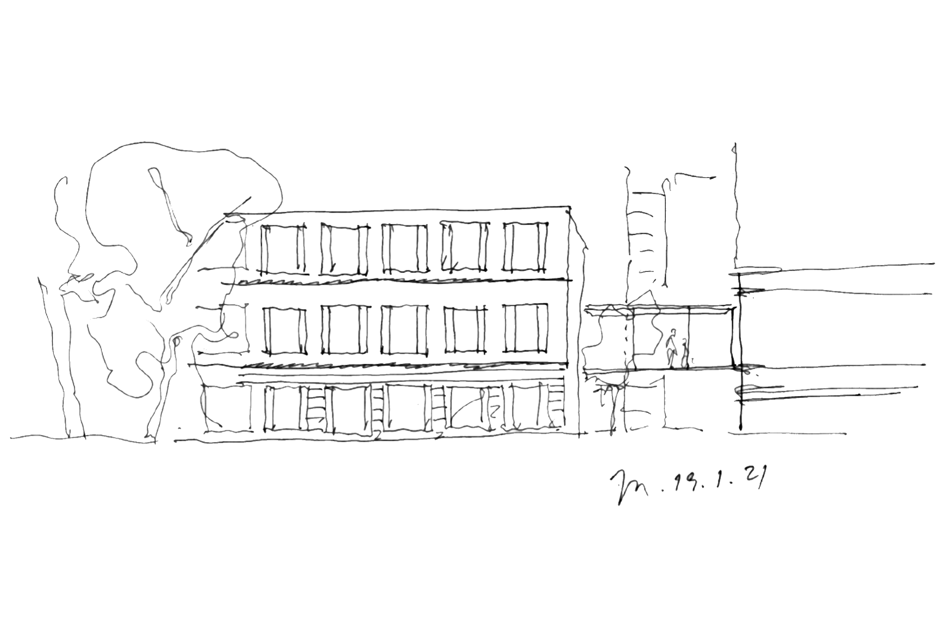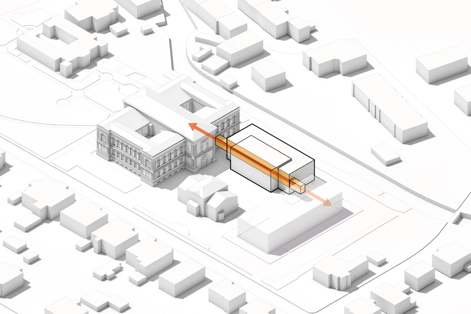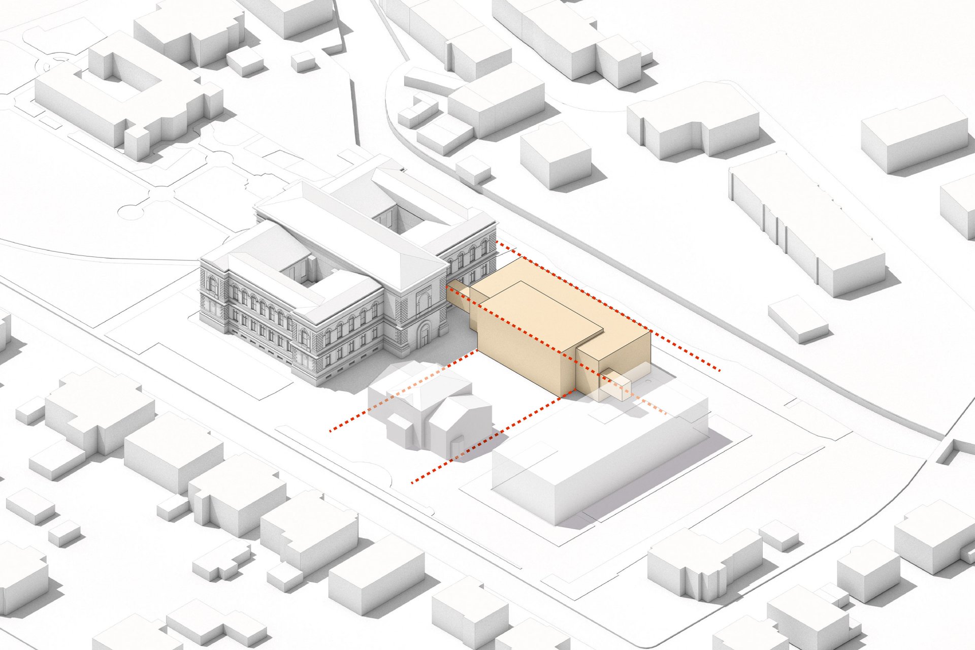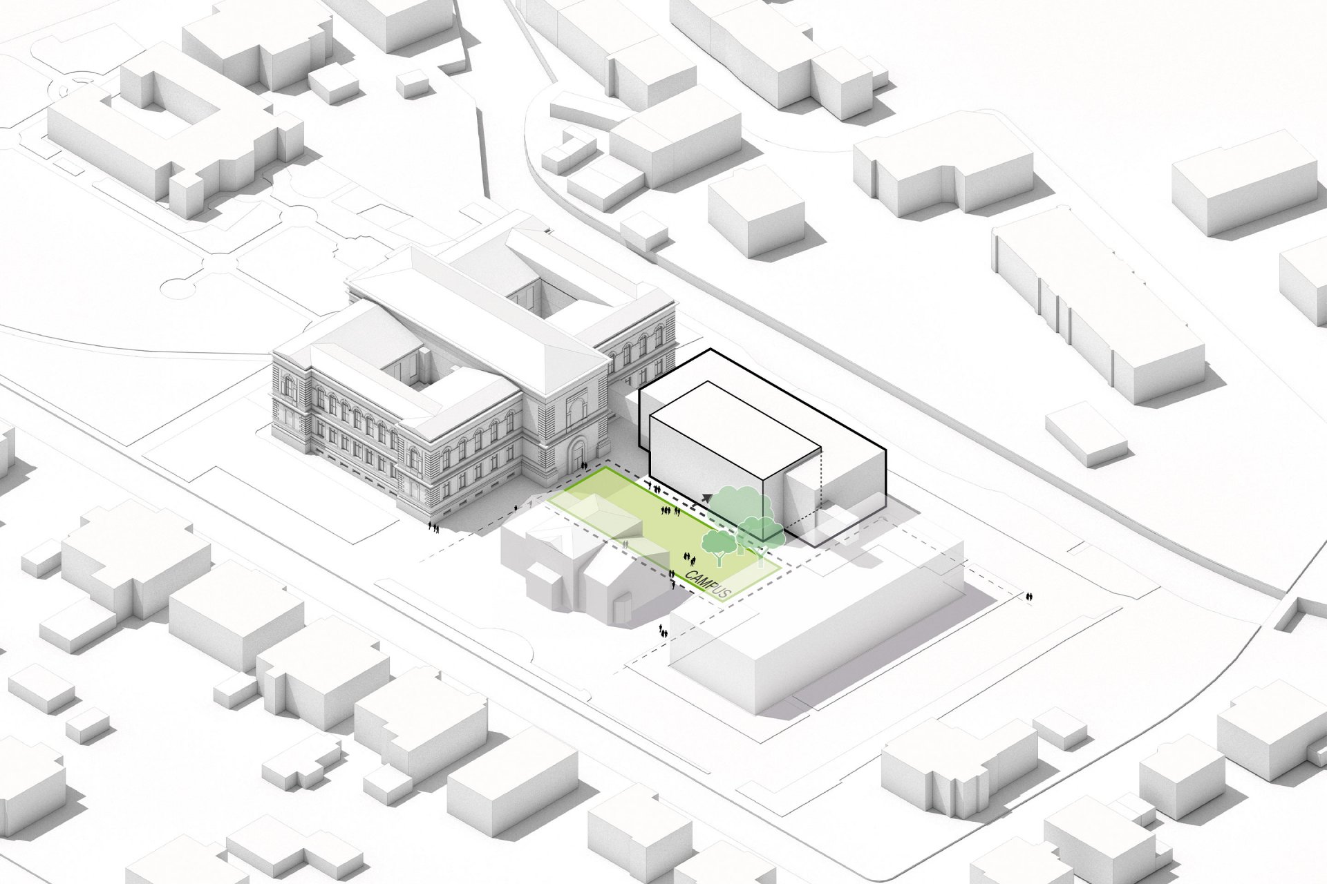 Wir entwerfen einen Neubau, der sich in Form und Materialität dem Bestand anpasst und als neuer Baustein den Campus vervollständigt.