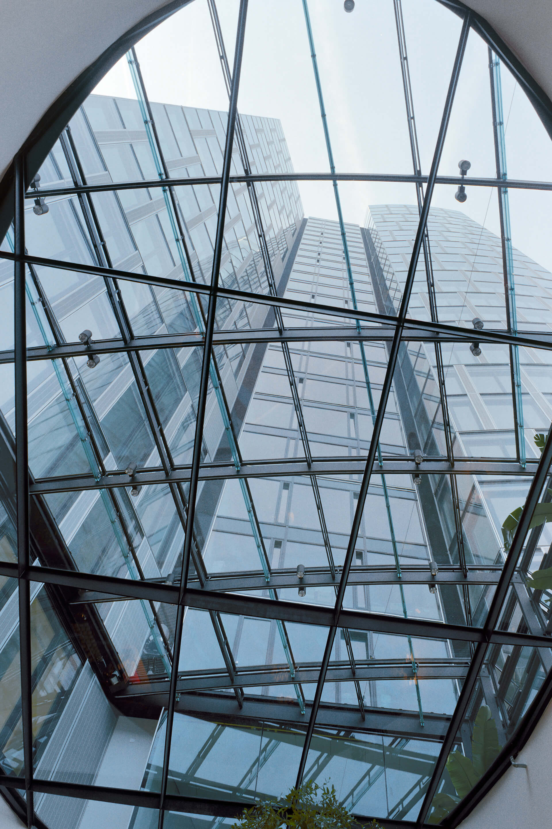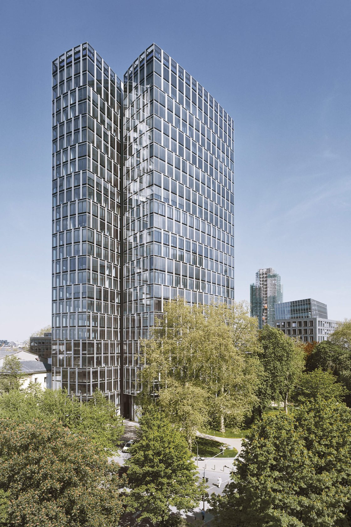 对我们而言,技术智能、可持续的高层建筑意味着:建立一套高效能的建造原则,节约使用各种材料和能源,当然最重要的是符合建筑美学、优雅的设计方案。我们在 2006 年通过 WestendDuo 项目实现了上述目标。这座建筑高度只有 96 米,属于法兰克福规模较小的塔楼。尽管如此,它仍然提供了 25 个层楼的充足的办公空间。在基座处有宽敞的公共区域。建筑物明亮的空间带给人舒适感。