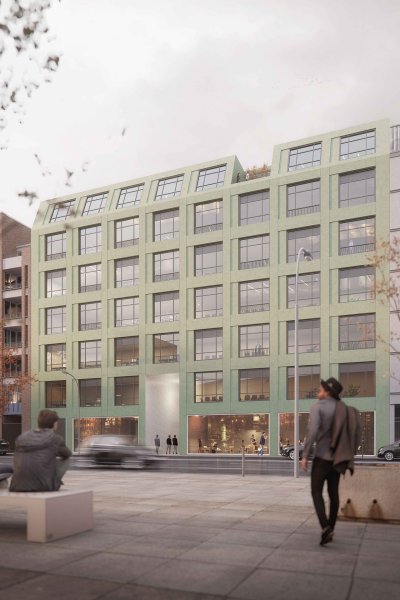 Preserve, renew, expand: this is the guiding theme of our design for the new office and commercial building in Berlin, for which we were awarded 1st prize in the JAAS Group’s architectural competition in 2022. The ensemble with an above-ground gross floor area of approx. 7,600 square metres consists of a new building with a side wing on the street front and an existing factory building with a coach house, which is to be converted and integrated into the project. The buildings have a gross floor area above ground of around 7,600 square metres, of which around 3,300 square metres are serviced flats and around 3,750 square metres are office space for new work concepts in the new building. The latter closes the gap between the buildings on the eastern side of Koloniestraße and the associated perimeter block in the Wedding district. Large shop windows on the ground floor for the approximately 550 square metres of commercial and retail space convey an inviting character towards the street. The façade is characterised by green pigmented concrete and creates a colourful contrast to the neighbouring buildings. The design by KSP Engel was awarded a DGNB platinum pre-certificate for the new building.