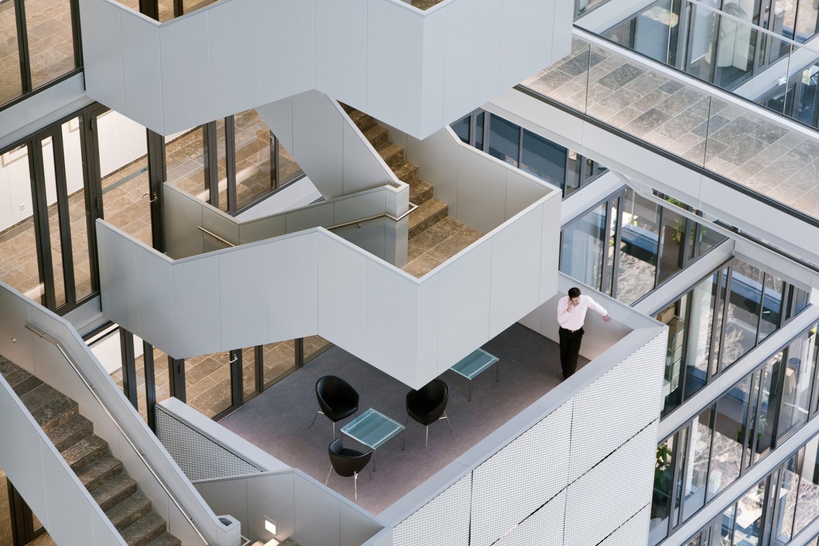 Floor-to-ceiling windows for the office spaces, glass dividing walls for corridors, and glass railing panels along walkways and bridges: The open architecture of the Deutsche Börse head office makes the activities of those working inside it entirely transparent. We used glass to create visual axes within the building, including across different levels. Glazed elevators and open staircases connect different floors and ensure everything is close at hand, while discussion booths, viewpoints, wide corridors and roof terraces offer additional space for exchanging ideas and information –an important factor in a good communication culture.