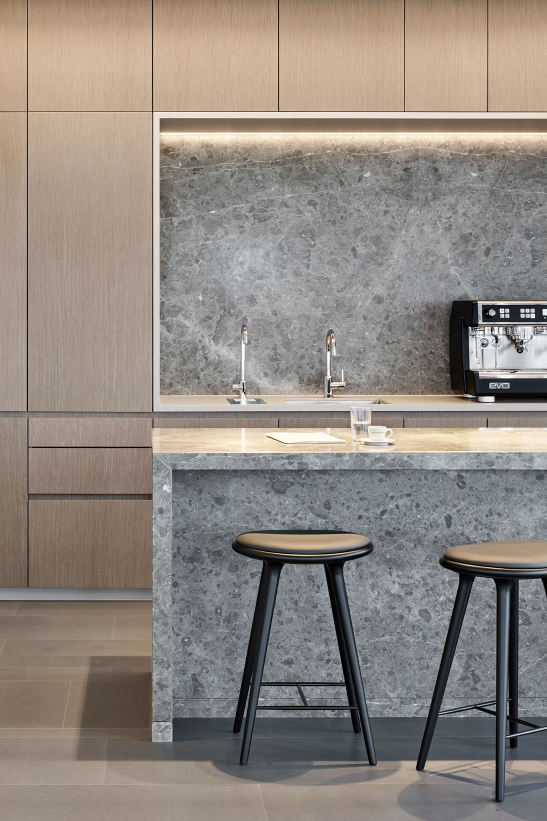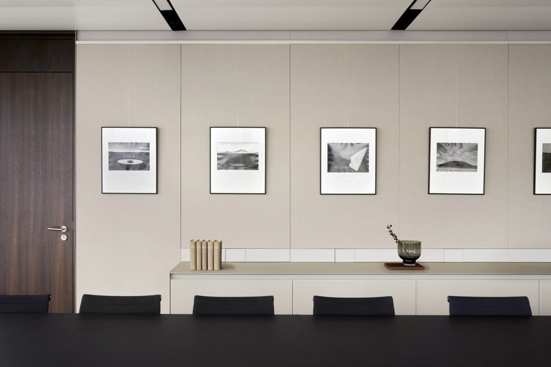 The lounge on the 18th floor with its open barista kitchen and its view out over the skyline and the roofs of Frankfurt is the vibrant heart of this law practice. In the kitchenette, wooden surfaces and gris du marais – a classic French marble – transform this central element into an elegant eyecatcher. Strip lights accentuate the individual textures. It is here that colleagues join for lunch or for small meetings or maybe just for a coffee. We have repeated this color/material concept in the kitchenettes on every floor. They enjoy a central location in the double high-rise and serve as points of communication between the individual office environments. Choice furniture and customized fixtures and fittings made of sensitively coordinated materials complement the elegant color schemes and materials. Works by a reputed artist specially commissioned for the law firm are in perfect harmony with our interior design, lending every story its own specific identity.