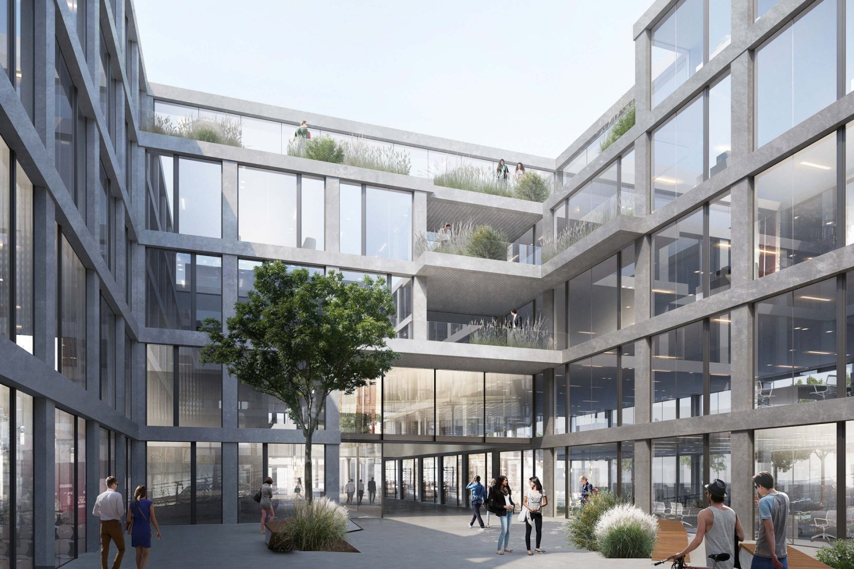 We have devised the green podium and the two inner courtyards to function as an urban stage. Beneath them lie the single-story underground carpark. The intervening spaces (“Green Hubs”) between the building sections act as informal meeting and communication points – and can be used as think tanks, meeting spaces or meeting rooms. The different outdoor greened areas enable us to bond the world of work and nature. The façade with its industrial feel imbues the building with a modern aesthetic and respectfully references the 1960s industrial buildings that once characterized the quarter.