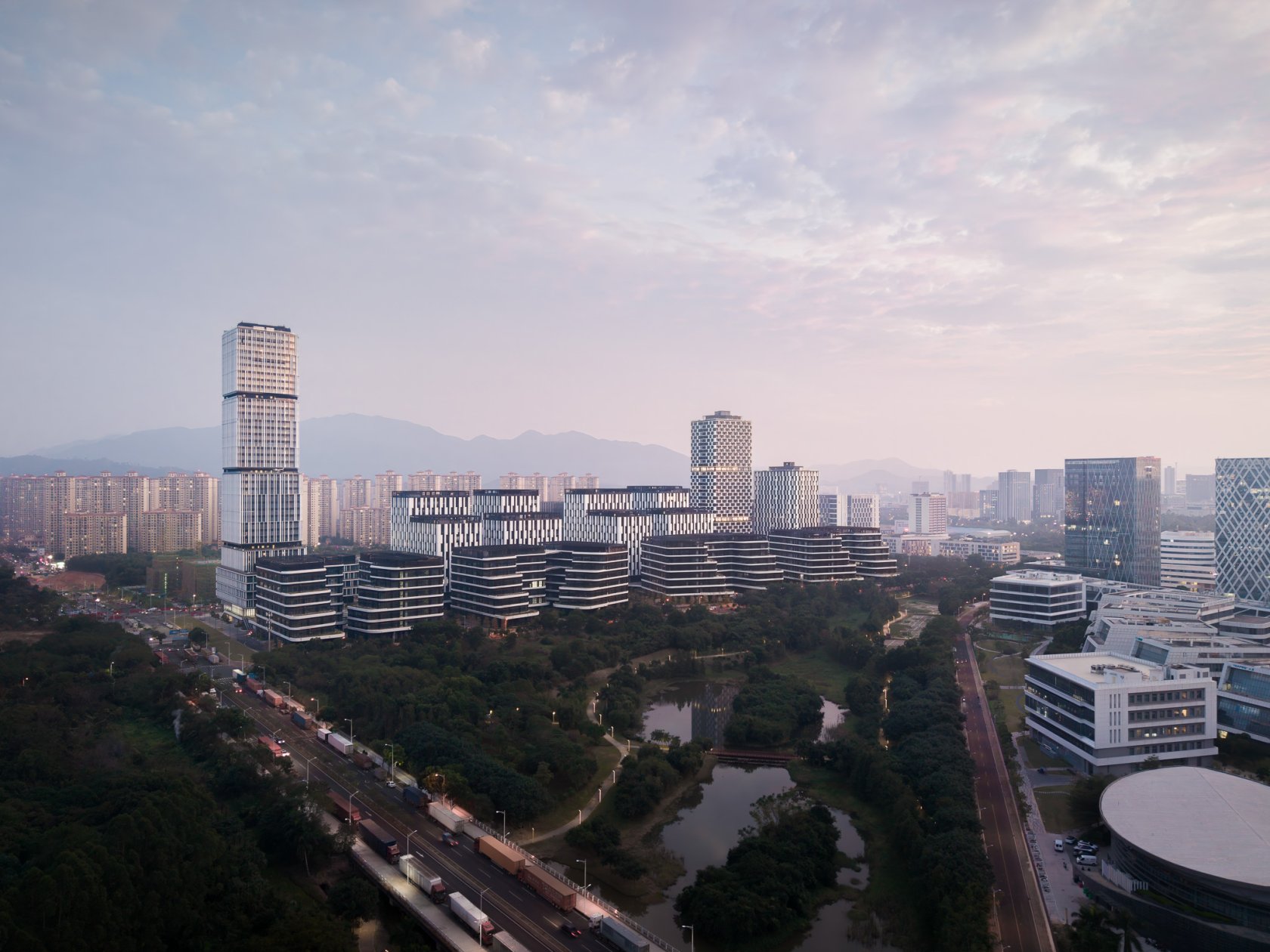 Die urbanen Eckpunkte werden durch drei Hochhäuser städtebaulich prägnant akzentuiert. Von der Blockrandbebauung staffeln sich die Gebäude kaskadenartig ab und gehen mit weit auskragenden Fußgängerplattformen organisch in eine großzügige, neugestaltete Parklandschaft über, die zum integralen Bestandteil des Entwurfs wird. Als Erholungsangebote und Kommunikationszonen bietet er zudem ein Kulturzentrum sowie Sportanlagen.