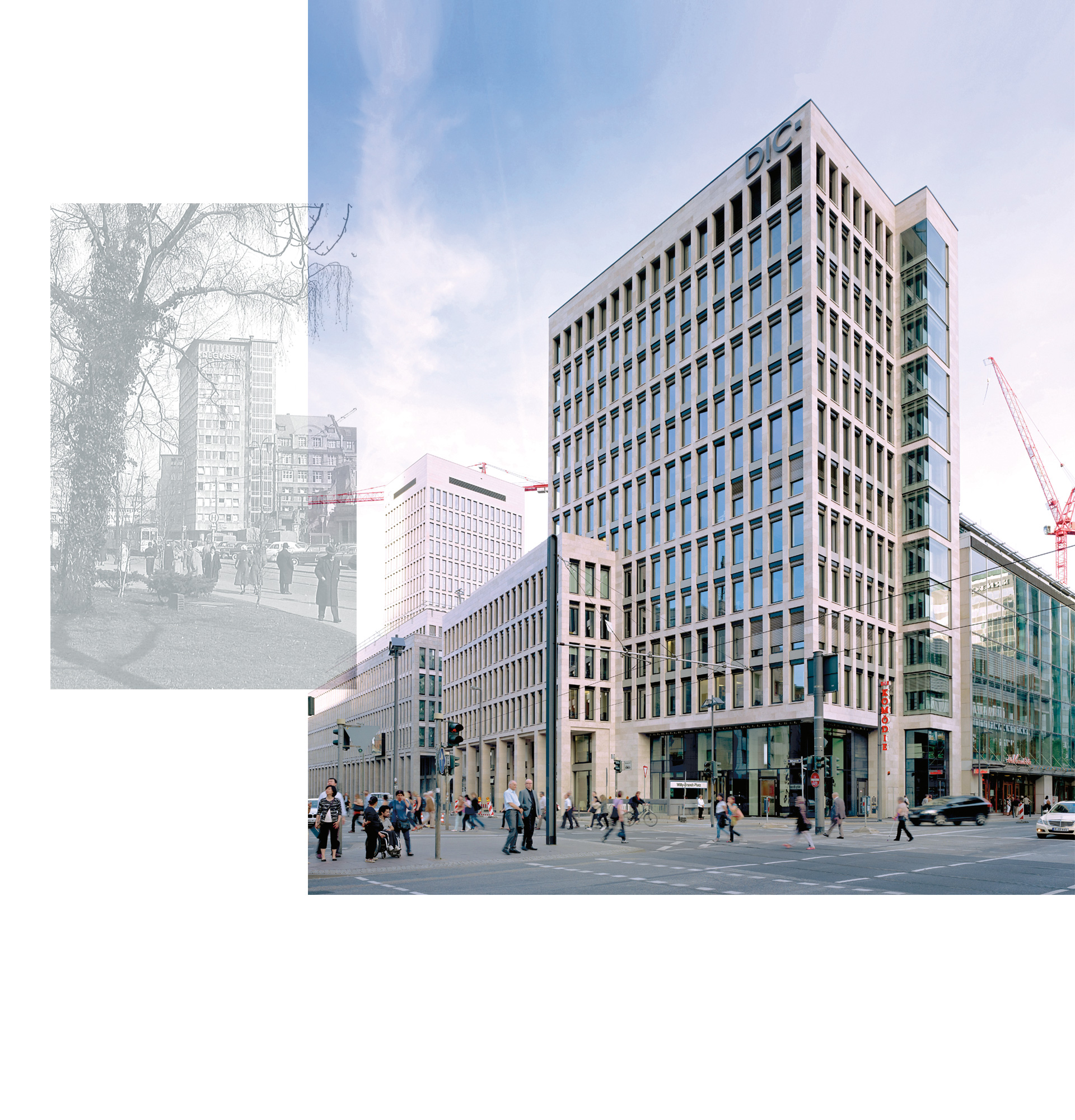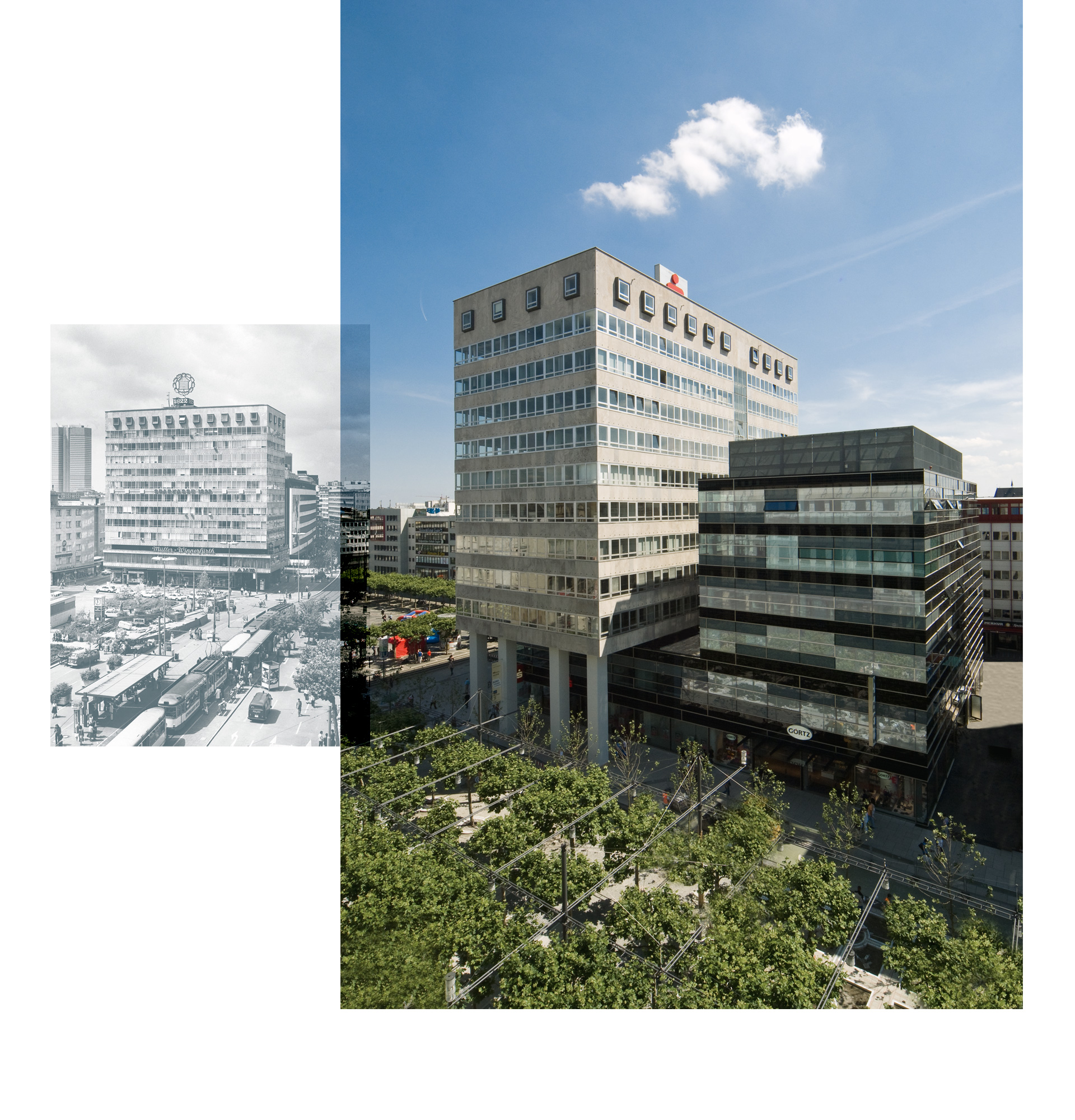 “Dadurch, dass der Anbau des Degussa-Hochhauses eine zweigeschossige Arkade erhielt, wurde aus der abweisenden Wirkung plötzlich eine einladende Geste an die Passanten.”