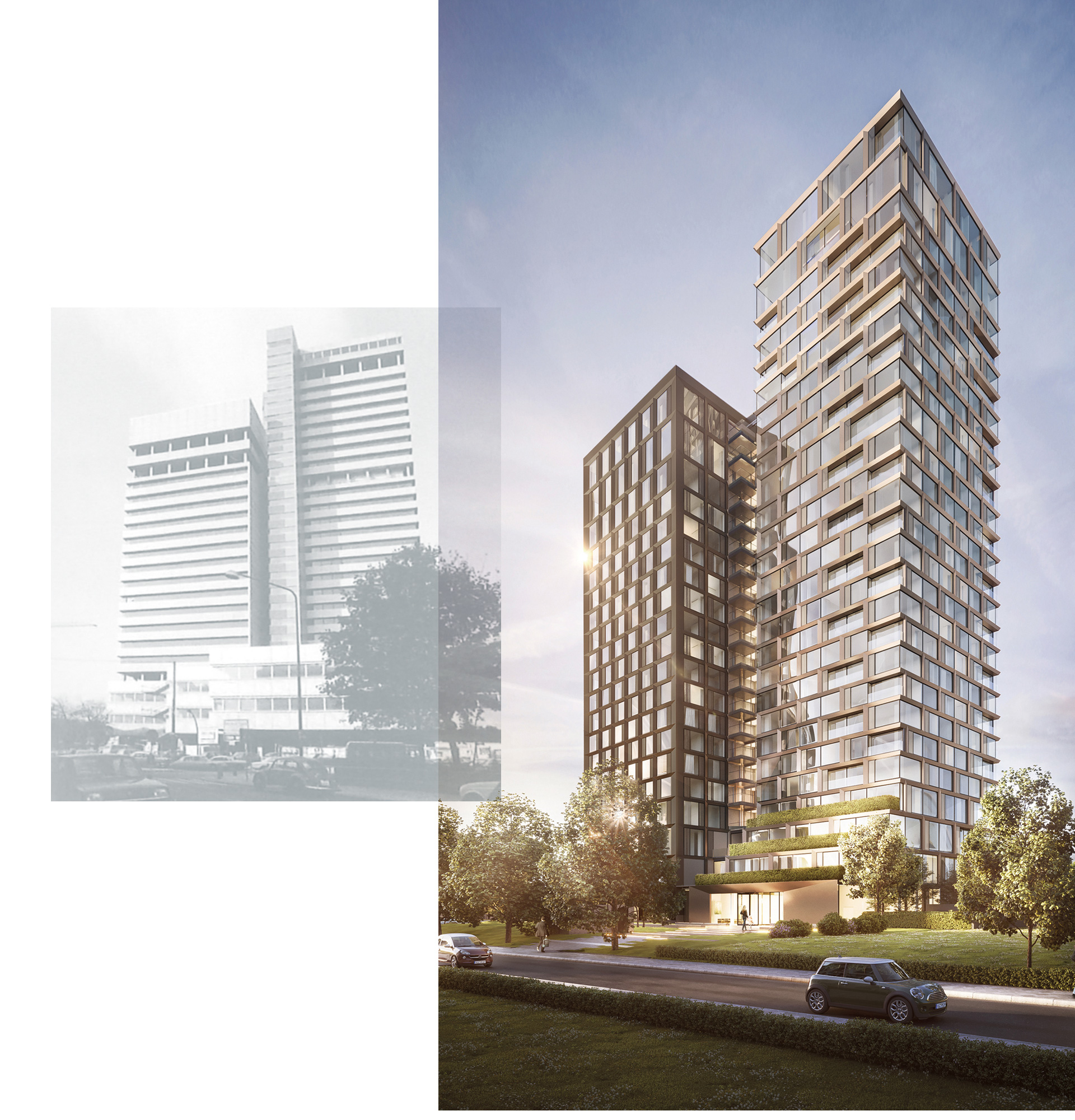 Das ästhetische Potenzial der Grundfigur wurde erst jetzt gehoben. Dass es sich um einen Doppelturm handelt, wurde durch die bisherige Spiegelfassade beinahe unkenntlich gemacht. Künftig wird sich das Hochhaus am Park gewissermaßen als zweieiiger Zwillingsturm präsentieren: Der höhere Wohnturm erhält eine helle Fassade mit hohem Glasanteil und ausgeprägter Rhythmisierung, während der niedrigere Hotelturm mit einer dunklen, regelmäßig gestalteten Fassade versehen wird. Das neu gestaltete Duo im Westend, das zugleich markanter und offener daherkommt als der Vorgänger, setzt auch der Nutzung nach ein Zeichen an die Nachbarschaft, dazugehören zu wollen. Darin könnte es als Vorbild für den Umgang mit anderen Bürogebäuden dienen, deren Eigentümer den Anschluss an die Zukunft suchen.
