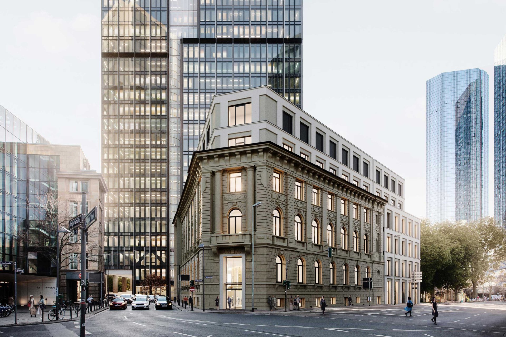 Das Credo unserer Entwurfsarbeit lautet: Ort, Kontext, Zeit und Nutzung einbeziehen. An der Mainzer Landstraße gab es bereits ein Neorenaissance-Bestandsgebäude, eine historische Rotunde - eine der wenigen erhaltene Kassenhallen eines Bankgebäudes aus dem Historismus -und viele moderne Hochhäuser. So entschieden wir uns bewusst für ein hybrides Ensemble. Anders als bei konventionellen Bürotürmen bildet unser Entwurf eine Triade aus Hochhaus, historischen Sockelbau mit Museum und öffentlicher Passage. Im Erdgeschoss entsteht eine durchlässige Eingangsebene zwischen Neuer Mainzer Straße und Wallanlagen als überdachter öffentlicher Raum. Über fünf Etagen erstrecken sich die öffentlich zugänglichen Nutzungen wie Restaurants, Café, Weinbar und Museum. Durch die publikumsintensive Verknüpfung von Büronutzung, Alltagsleben und Kultur erreichen wir, dass Stadtleben und Arbeitswelt ineinandergreifen.