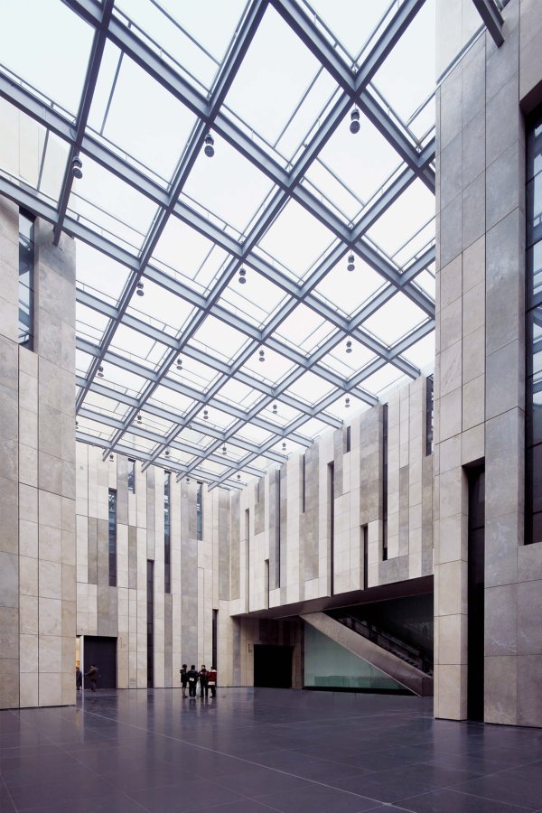 Sockel, transparente Halle und ein „schwebendes“ Dach stechen aus ihrer Umgebung heraus und bringen auf subtile Weise Tradition und Innovation zum Ausdruck. Doch nicht nur architektonisch funktioniert dieses Konzept: Jede Ebene der Trias steht stellvertretend für Vergangenheit, Gegenwart oder Zukunft und bildet so eine Zeitachse des Kulturerbes ab.
