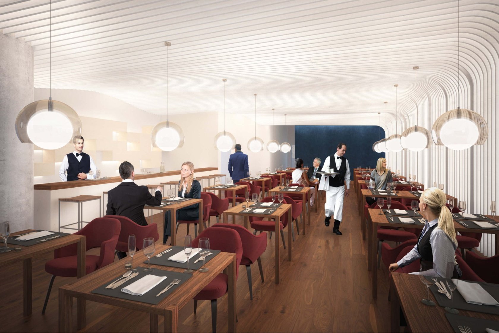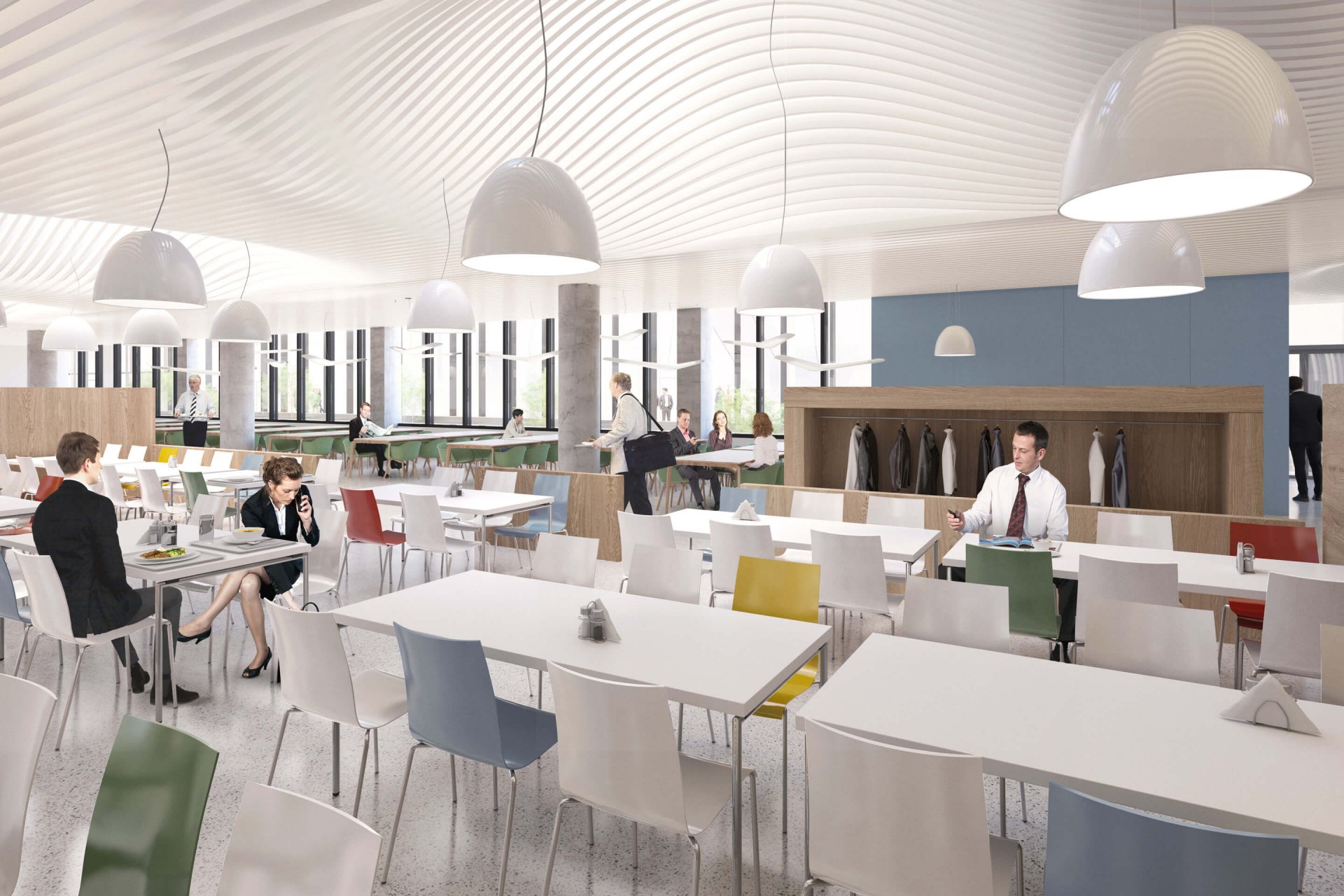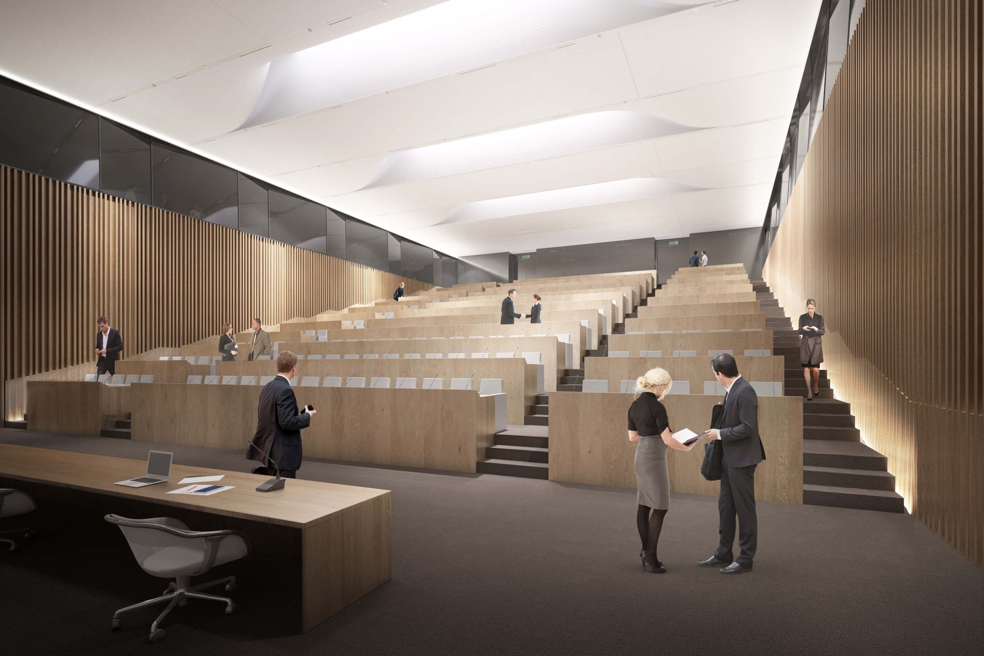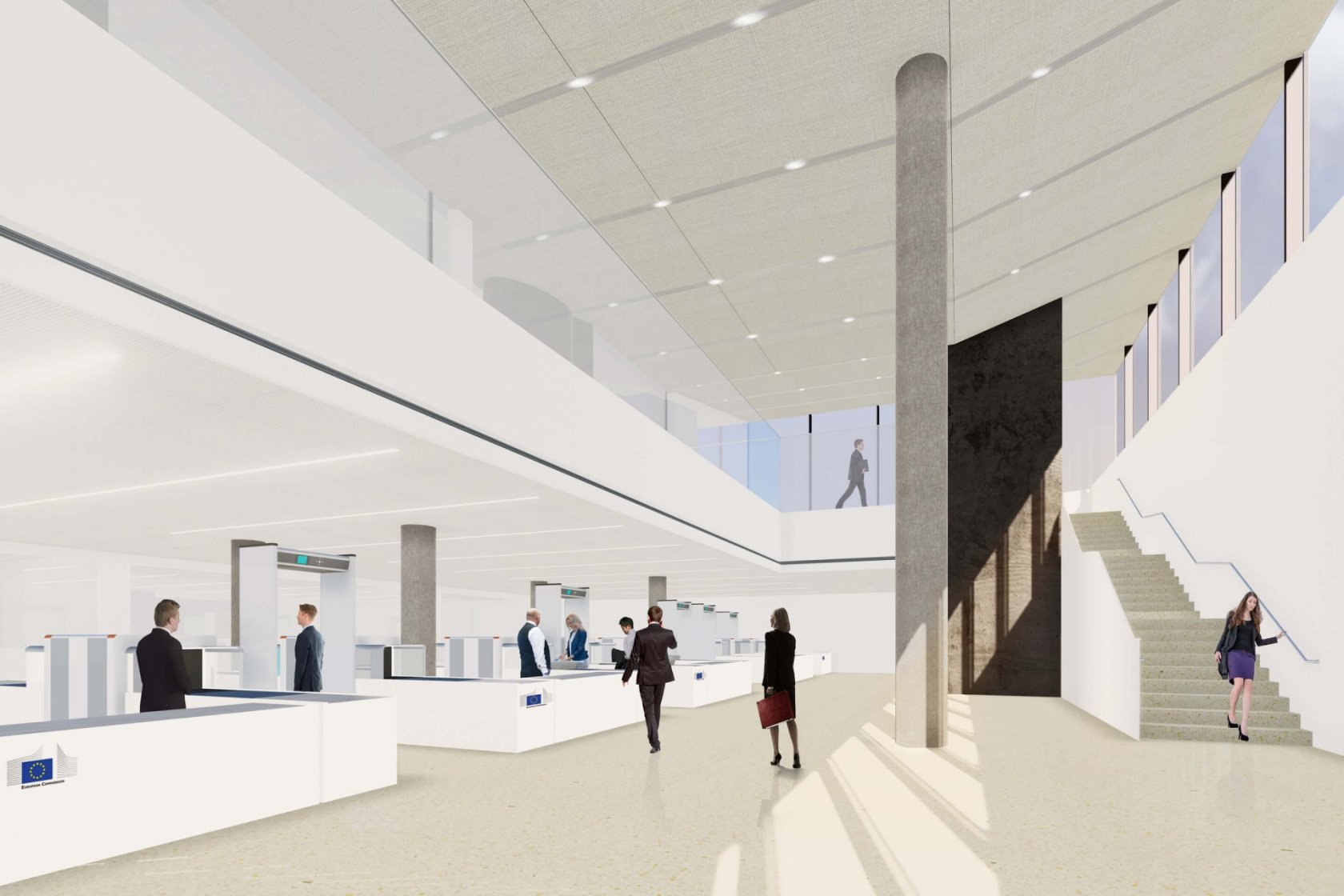 Die Offenheit des Europäischen Staatenbundes übersetzen wir architektonisch in eine einladende städtebauliche Geste: Die Eingangshalle, die „Hall of Nations“, setzt den öffentlichen Vorplatz nach innen fort und erstreckt sich als kommunikative Magistrale über die gesamte Tiefe des Gebäudes. Als Rückgrat des Neubaus und innenliegender Boulevard verbindet sie alle Abteilungen und Bereiche miteinander. Das fördert den Austausch unter den rund 3.920 Mitarbeiter*innen und Besucher*innen. Angebunden sind auch das Konferenzzentrum mit Auditorium, das Mitarbeiterrestaurant, die Cafeteria und die Bibliothek. Unterschiedlich gestaltete Orte der informellen Kommunikation – Stege, Besprechungsboxen und Treppen – sollen die Magistrale zusätzlich beleben.