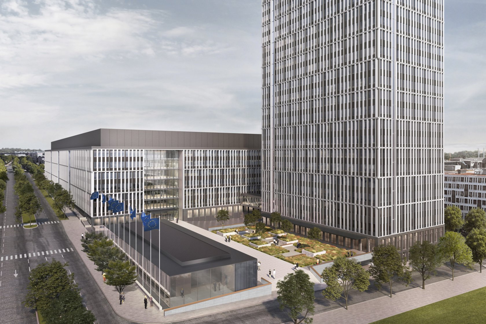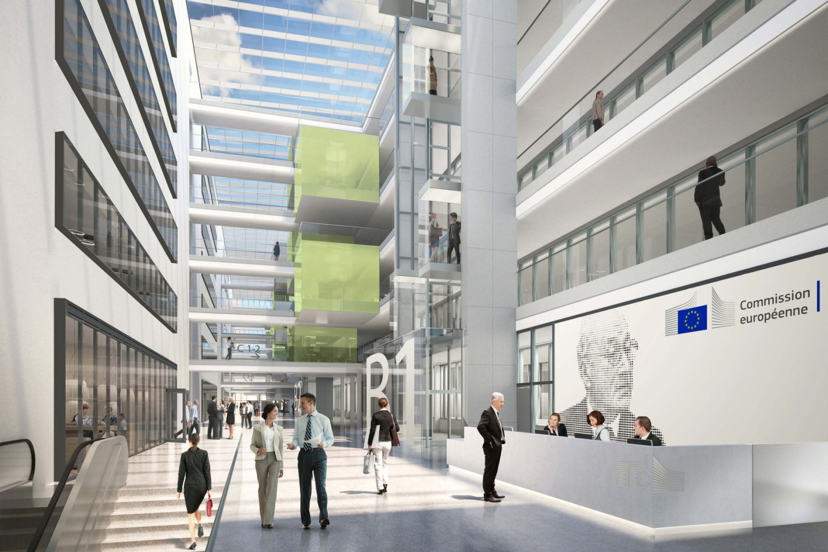 Dialog, Flexibilität und Offenheit sind nicht nur Leitwerte des Europäischen Staatenbundes, sondern zeichnen auch ein gutes Bürogebäude aus. Die städtebauliche Geste, die sich zum Vorplatz öffnet, bringt diese Werte zum Ausdruck.