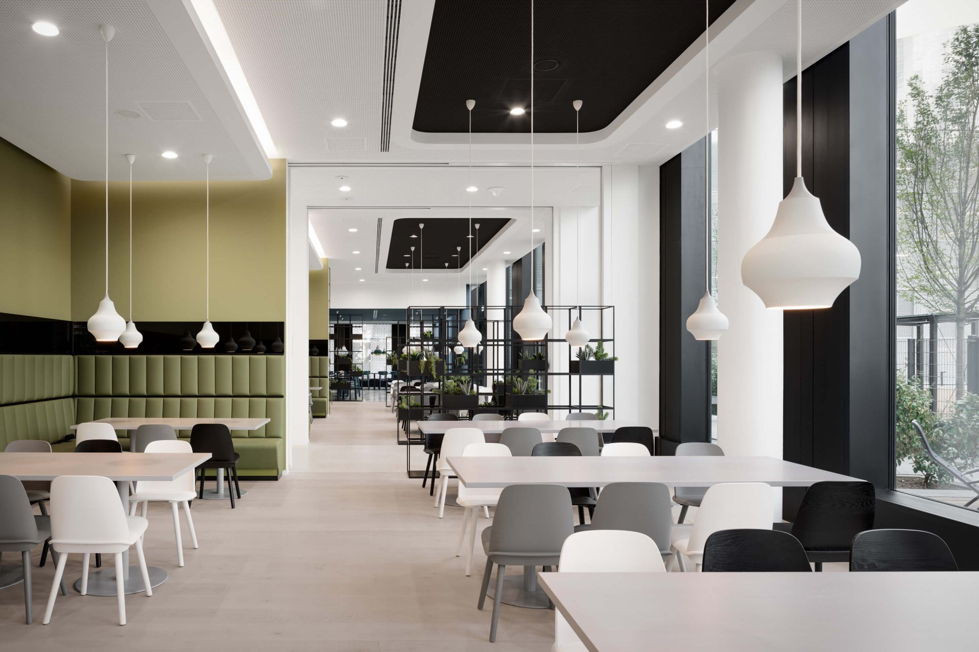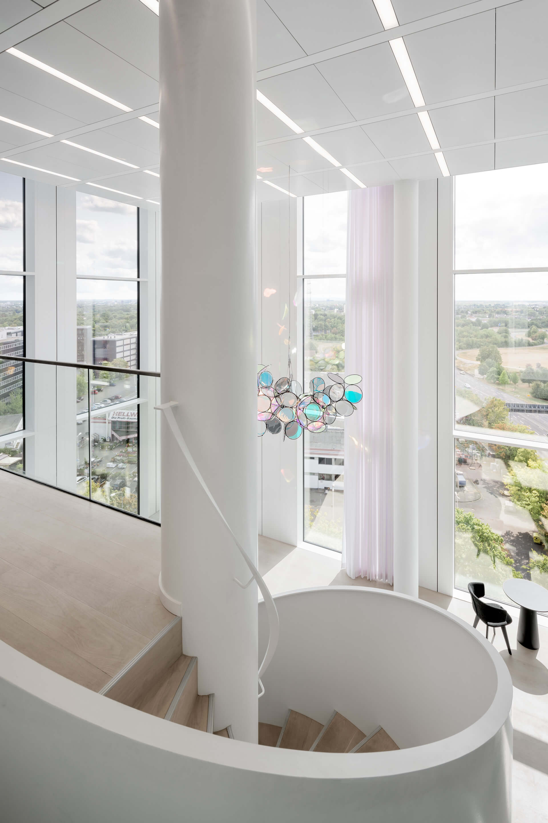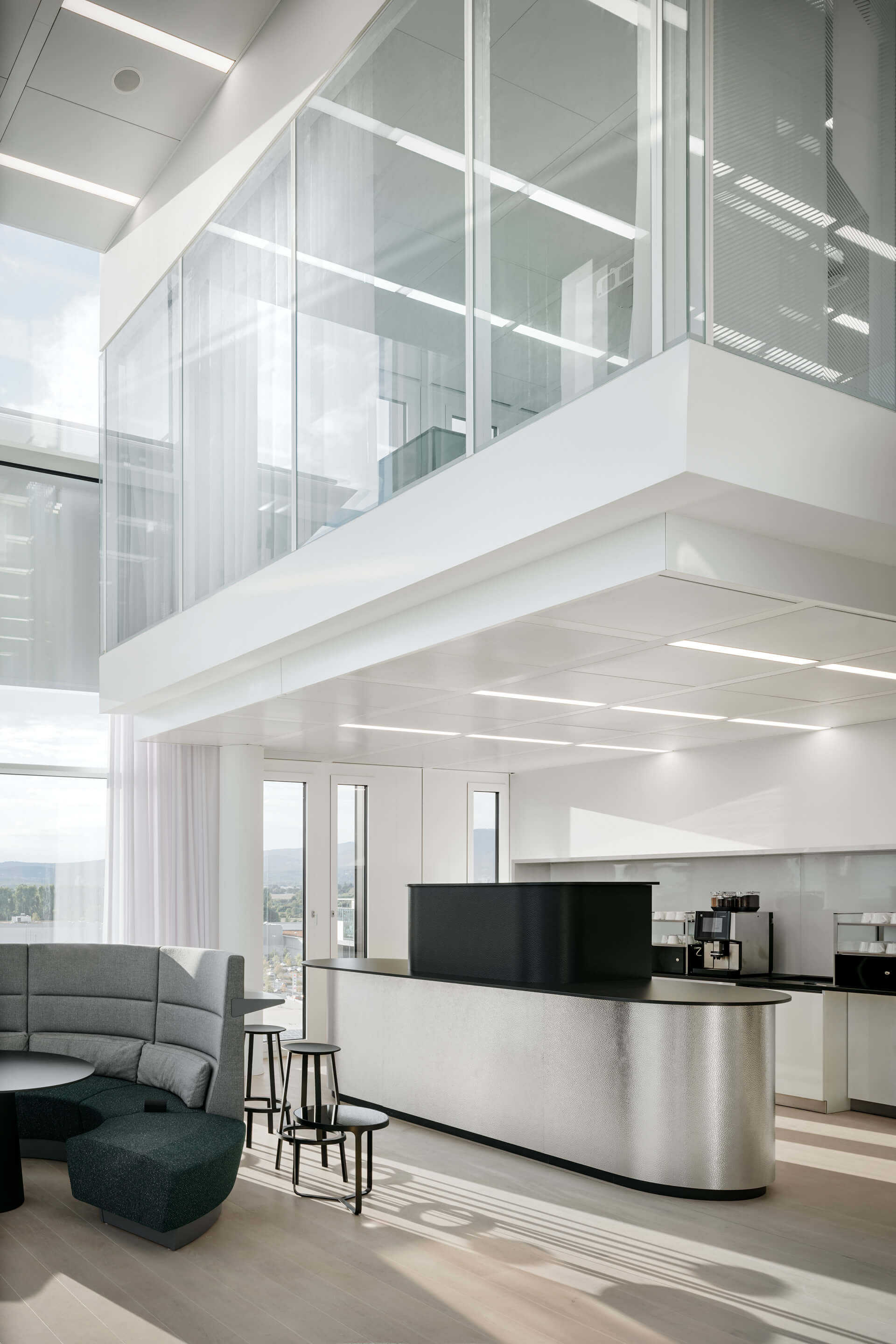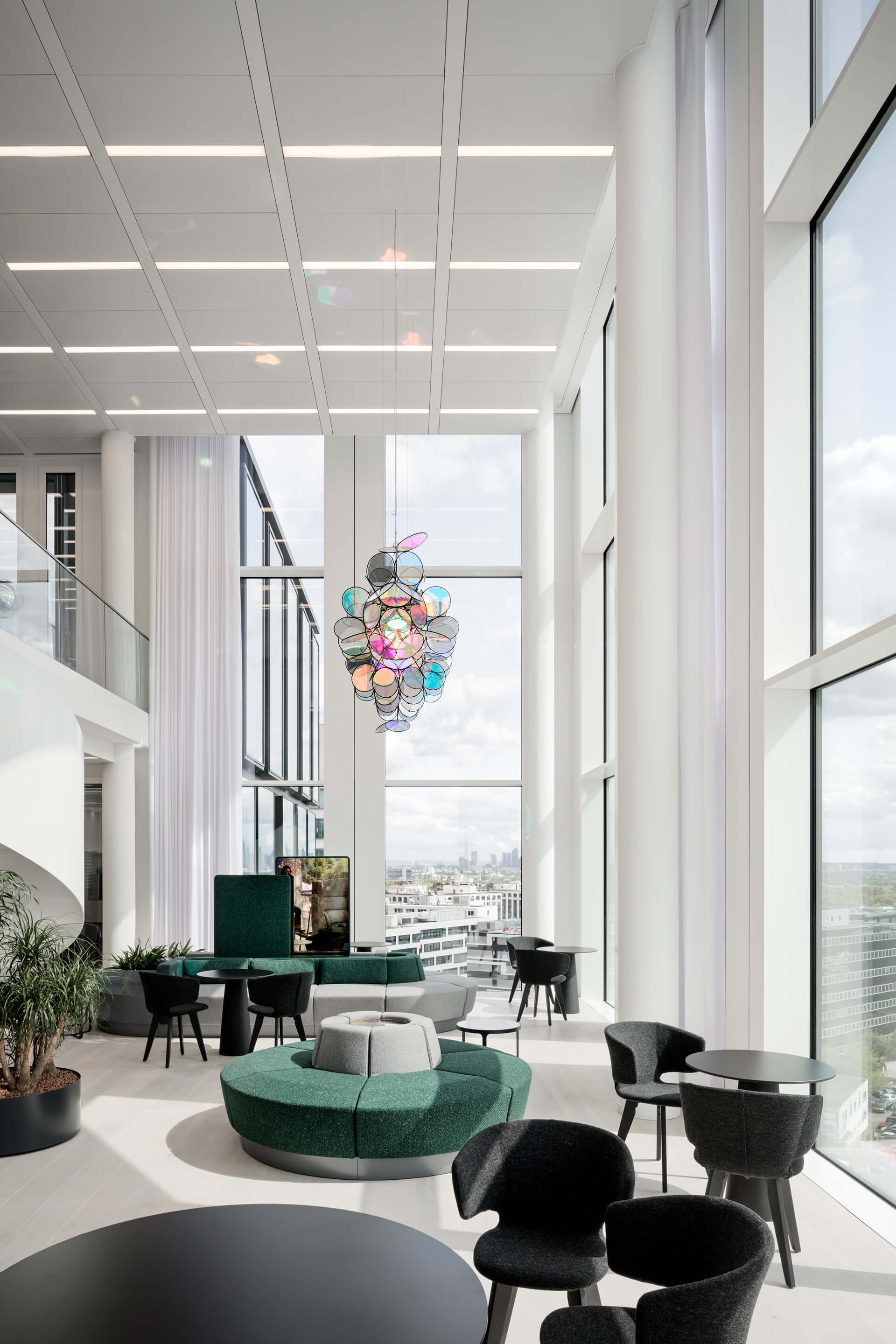 Mobiles Arbeiten und räumliche Flexibilität sind bei SAP seit vielen Jahren gelebte Praxis. Daher war es uns wichtig, einen Ort zu schaffen, der neben klassischen Büros, Design-Thinking-Räumen und dem (fast) obligatorischen Pausenraum mit Kicker-Tisch noch weitere Gemeinschaftsflächen integriert. Hierzu zählen der Empfang sowie ein einladendes Restaurant mit Café und eine zweigeschossige Lounge im vierten und fünften Obergeschoss für die MitarbeiterInnen. Highlight ist die Skylobby mit Dachterrasse, die einen spektakulären Blick auf den Taunus und die Frankfurter Skyline bietet.