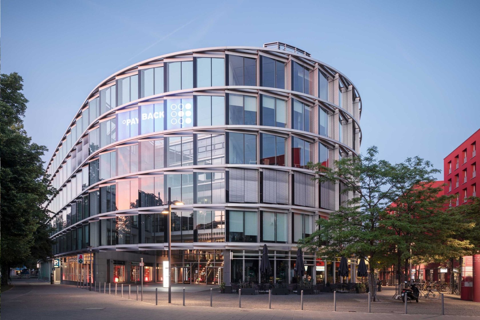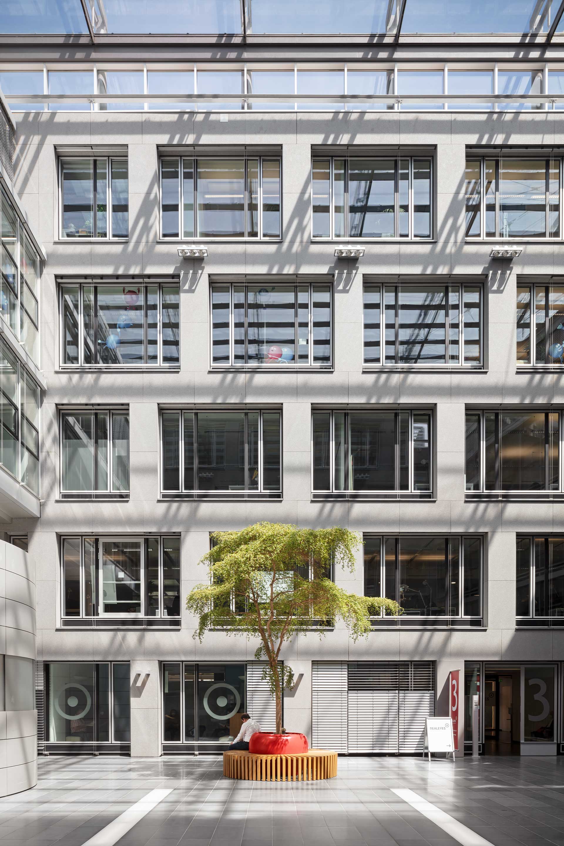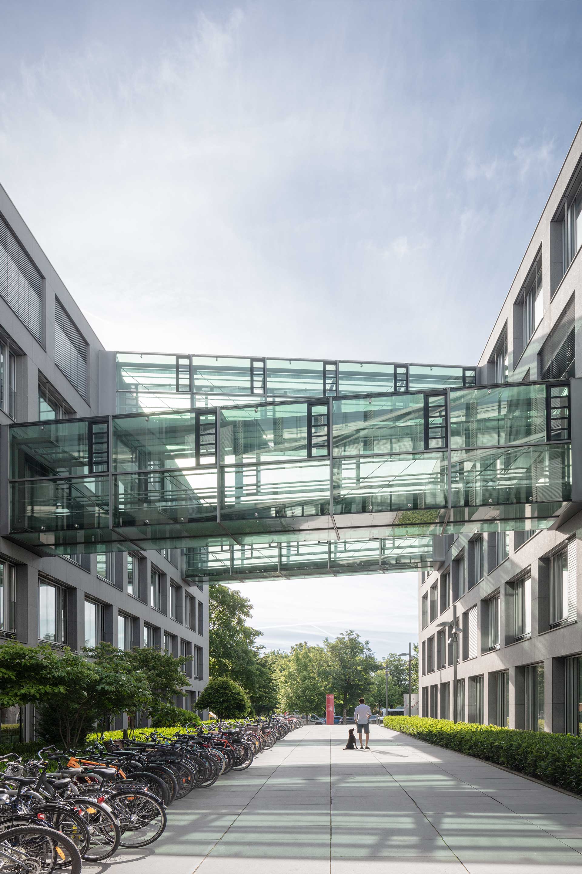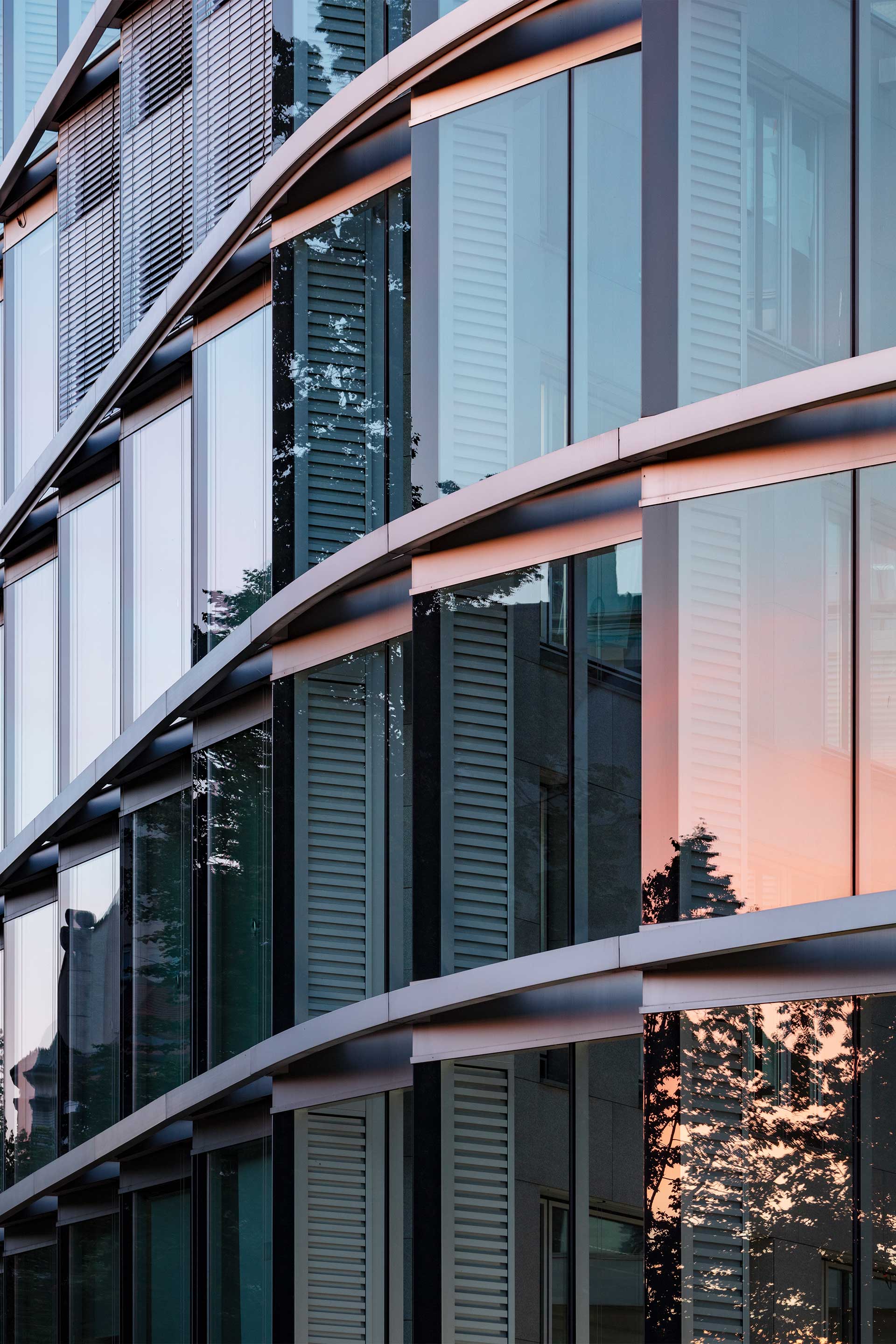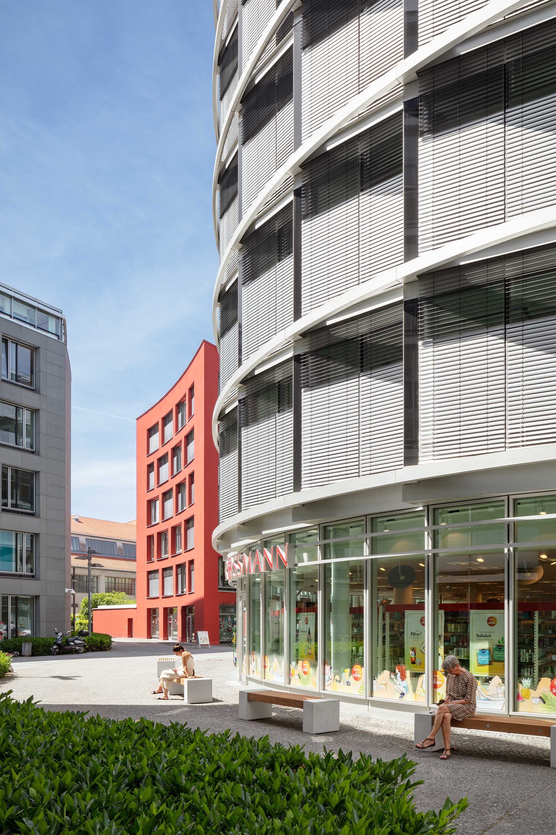 Wohnen, Büro, Gastronomie und Einzelhandel prägen das neue Viertel. Dieser Nutzungsvielfalt haben wir durch unterschiedlich gestaltete Gebäude Ausdruck verliehen: So besticht der geschwungene, amorphe Baukörper im Zentrum durch seine detaillierte Ausarbeitung der schuppenartigen Stahl-Glas-Fassade. Trotz seiner Größe wirkt er leicht und filigran. Im Kontrast dazu stehen die markanten Kopfbauten entlang der Theresienwiese mit ihrer klassischen Natursteinfassade. Die Wohnbebauung im Süden des Quartiers heben wir gestalterisch hervor: mit einer roten Putzfassade als Farbakzent. Zwischen Wohn- und Bürogebäuden sorgt die offene Fußgängerpassage mit Läden, Cafés und Dienstleistungen im Erdgeschoss für einen Mix aus Freizeit, Wohnen und Arbeiten.