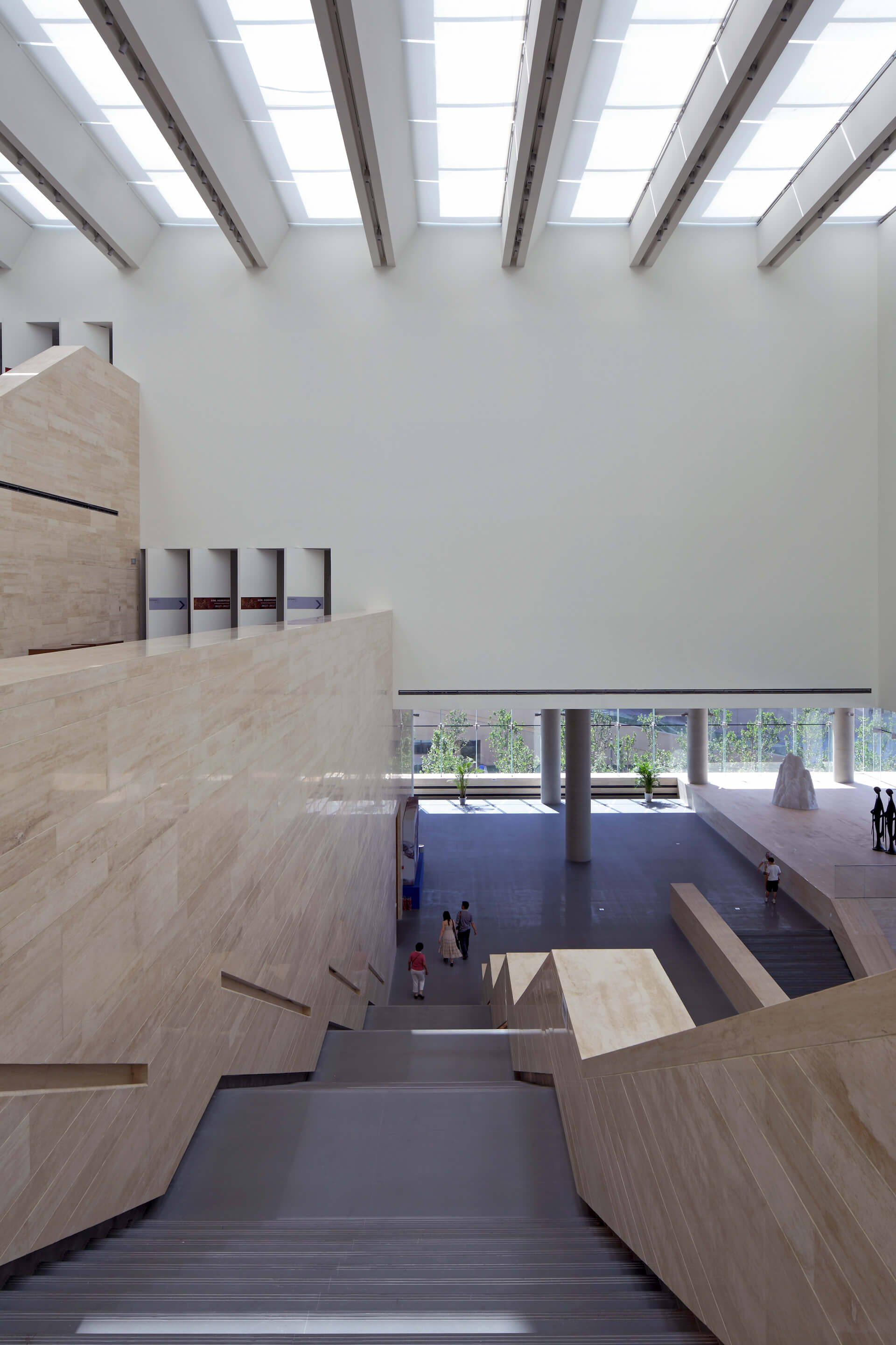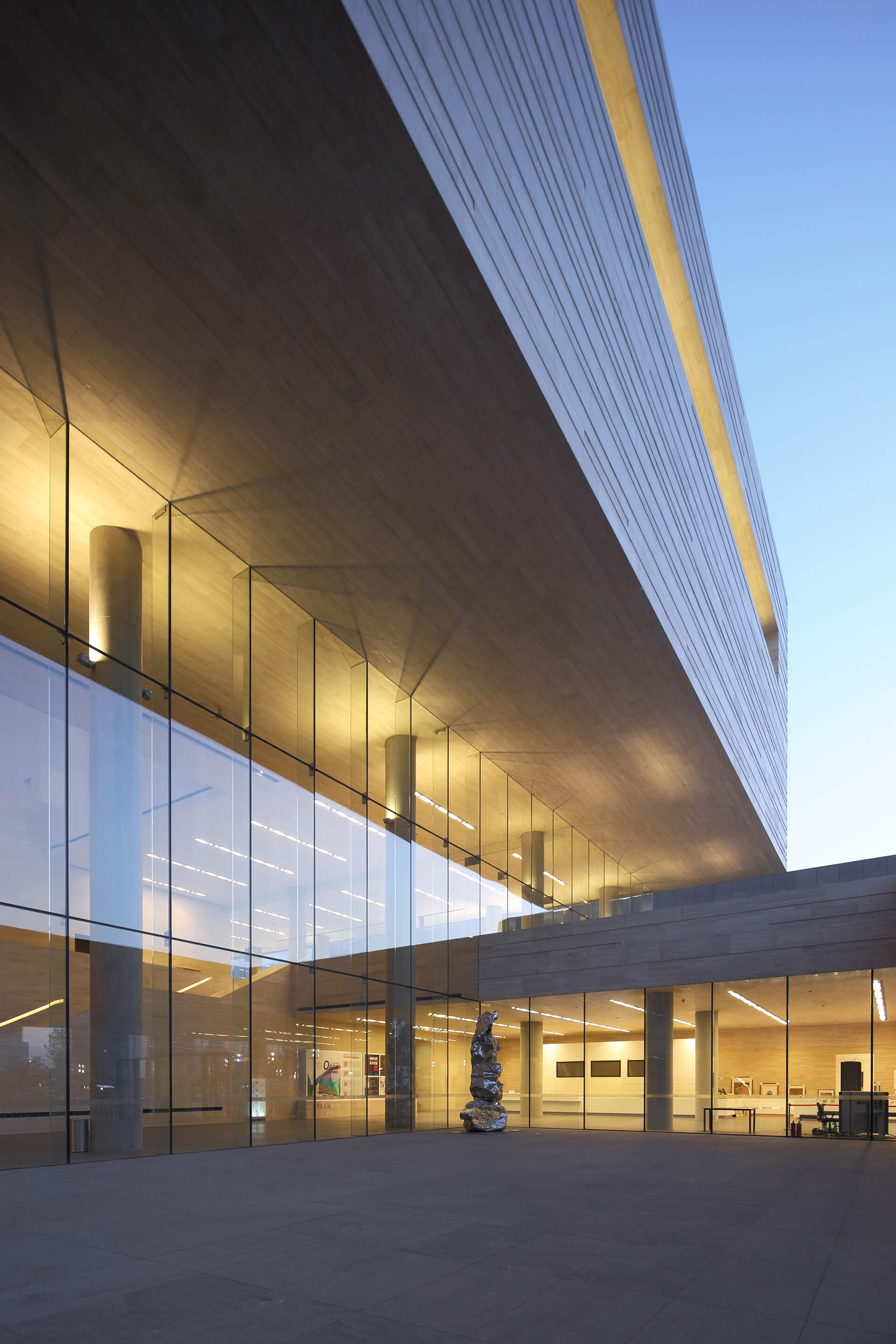 Die verglasten Fronten des Museums bieten tiefe Ein- und Ausblicke auf See und Park. Und auf die weiteren Kulturbauten, die den Museumsneubau einrahmen. Der großzügige Vorplatz lässt sich für Freiluftausstellungen nutzen. Wie die Teelounge auf der obersten Ebene gibt er den BesucherInnen die Möglichkeit, ihre Kunst- und Raumeindrücke nachklingen zu lassen. Im lichtdurchfluteten Atrium dient eine imposante Treppenkaskade als Tribüne mit Aussicht in den Park.