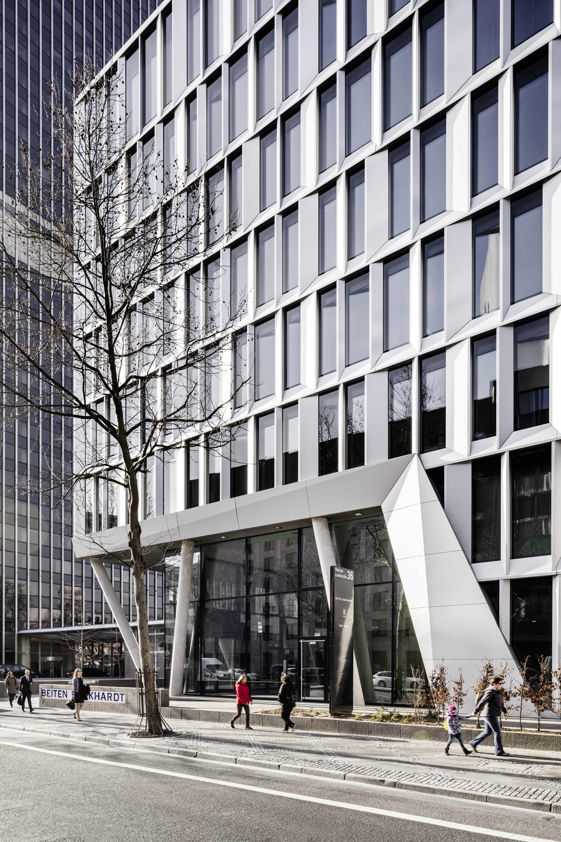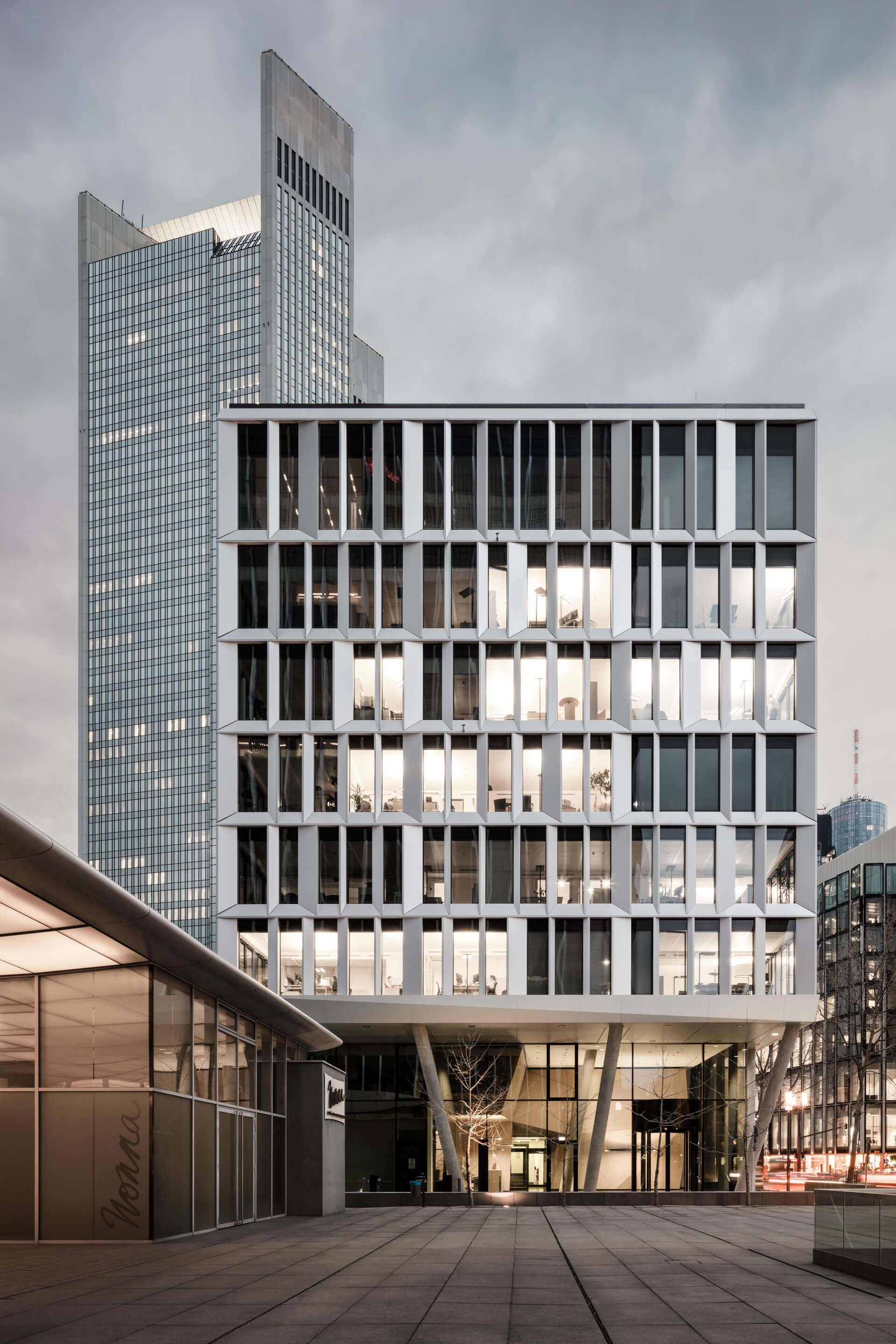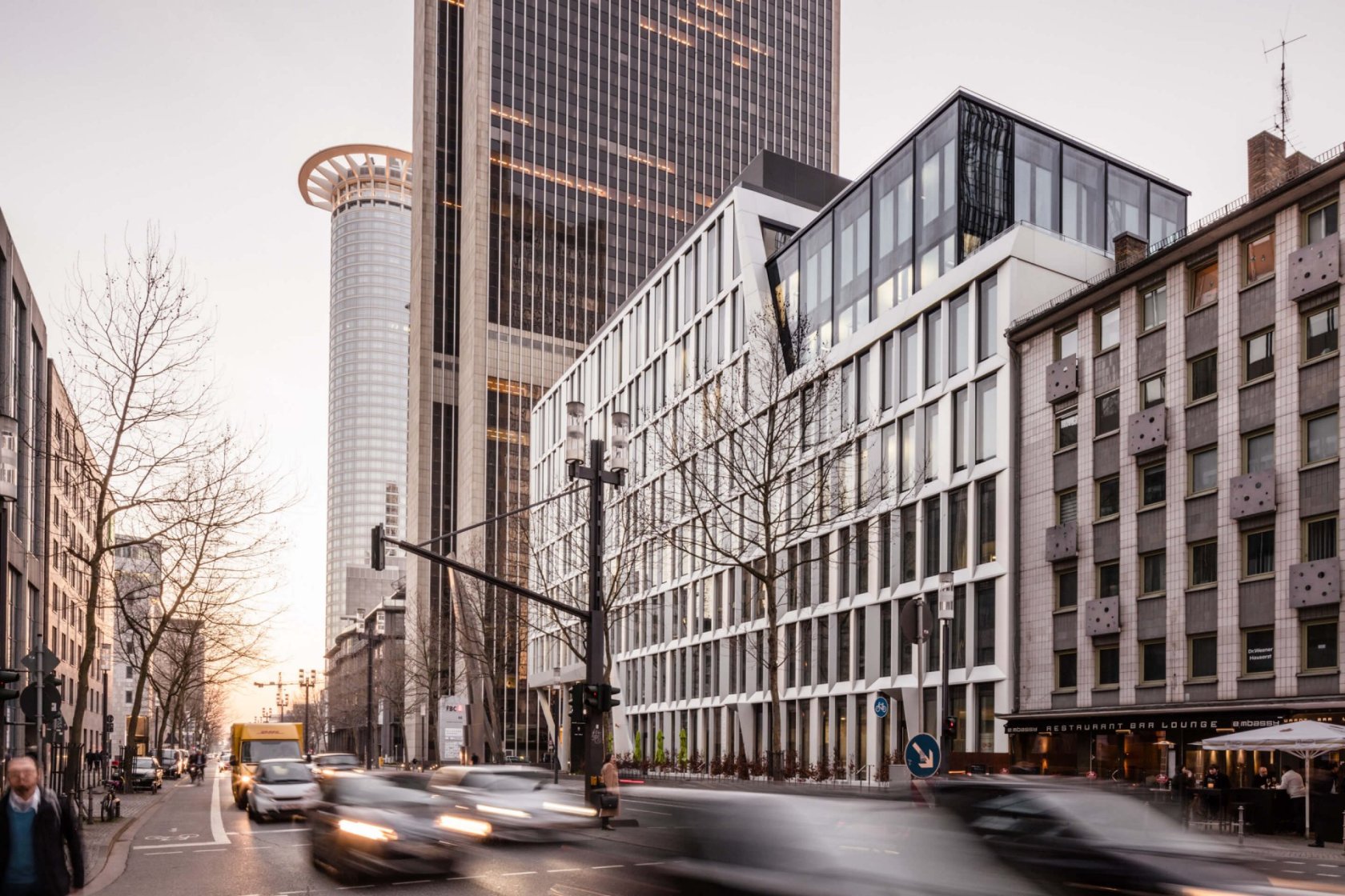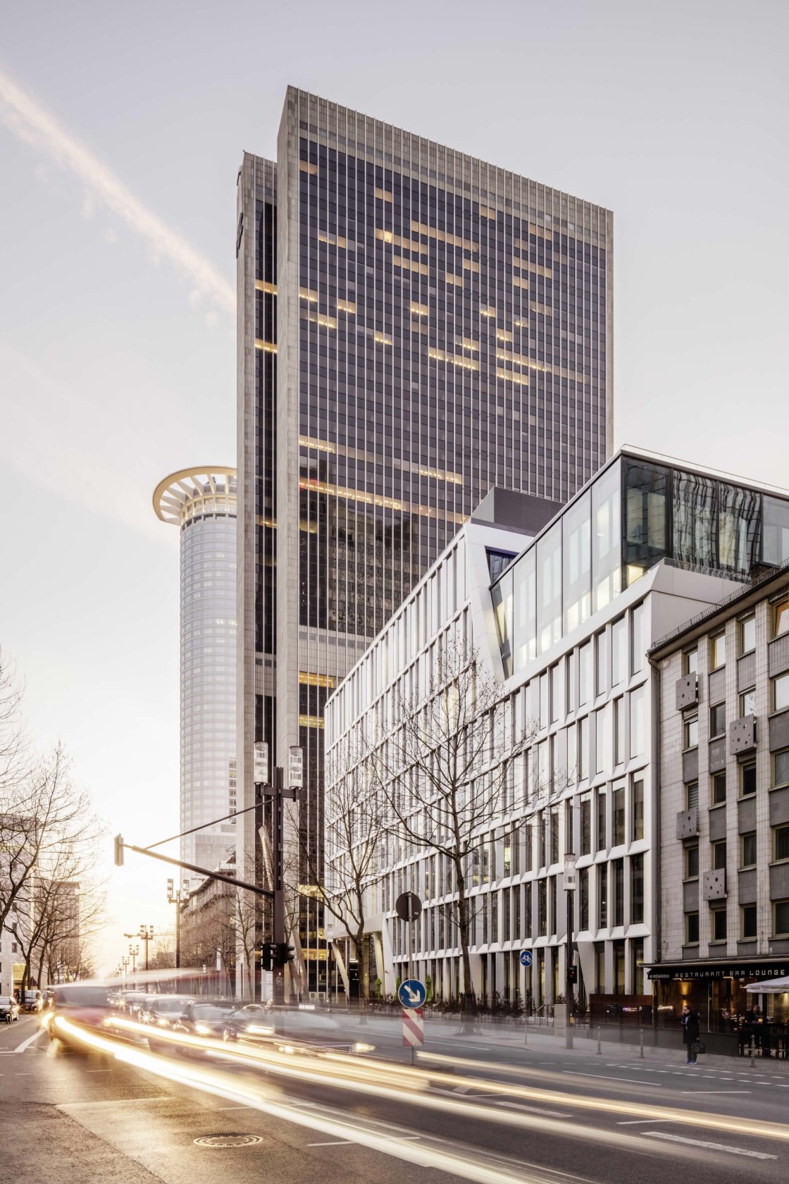 Die Mainzer Landstraße in Frankfurt am Main ist im City-Leitplan von 1983 als Standort für Hochhäuser vorgesehen. Türme und Geschäftshäuser säumen die Schnellstraße und markieren das heutige Wirtschafts- und Finanzzentrum der Stadt. Wir kennen das Gebiet wie unsere Westentasche, haben hier zahlreiche Häuser saniert oder neu gebaut. Doch jeder Standort verlangt nach individuellen Lösungen. Auf dem Grundstück zwischen dem 142 Meter hohen TCB-Scheibenhochhaus und dem 186 Meter hohen dreieckigen Trianon-Turm tut sich eine Freifläche auf. Eine rare Qualität im eng bebauten Finanzdistrikt.