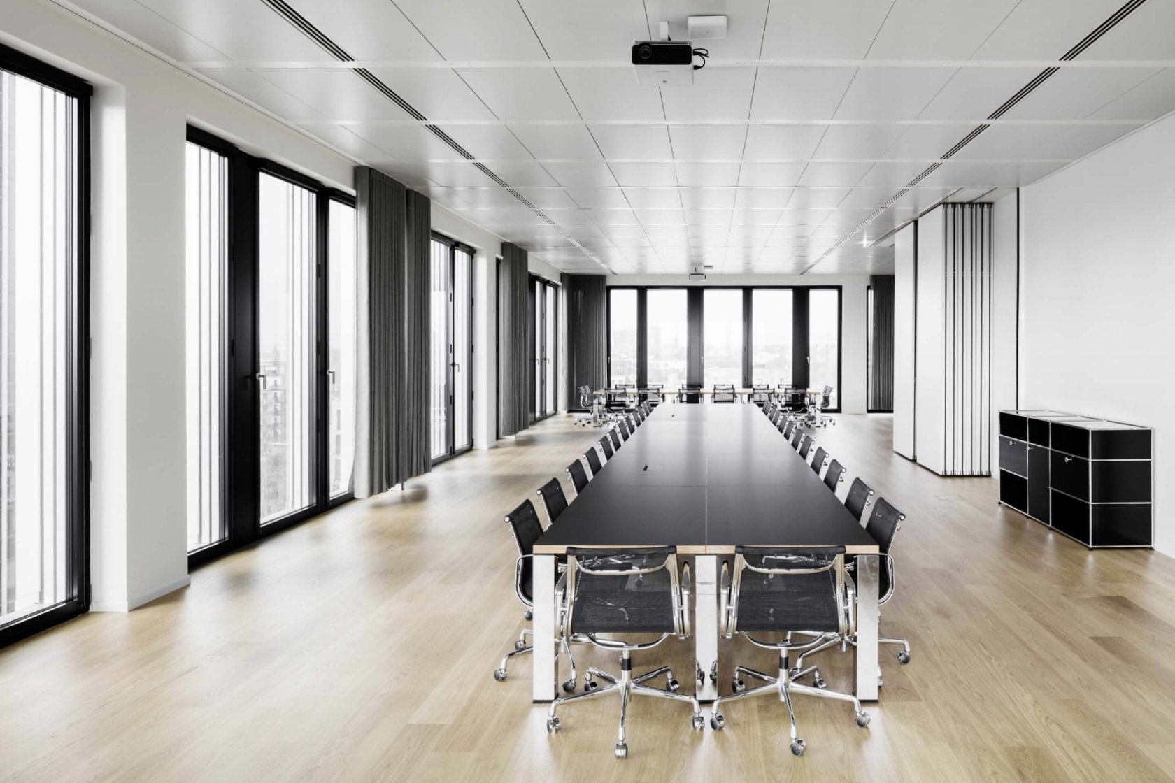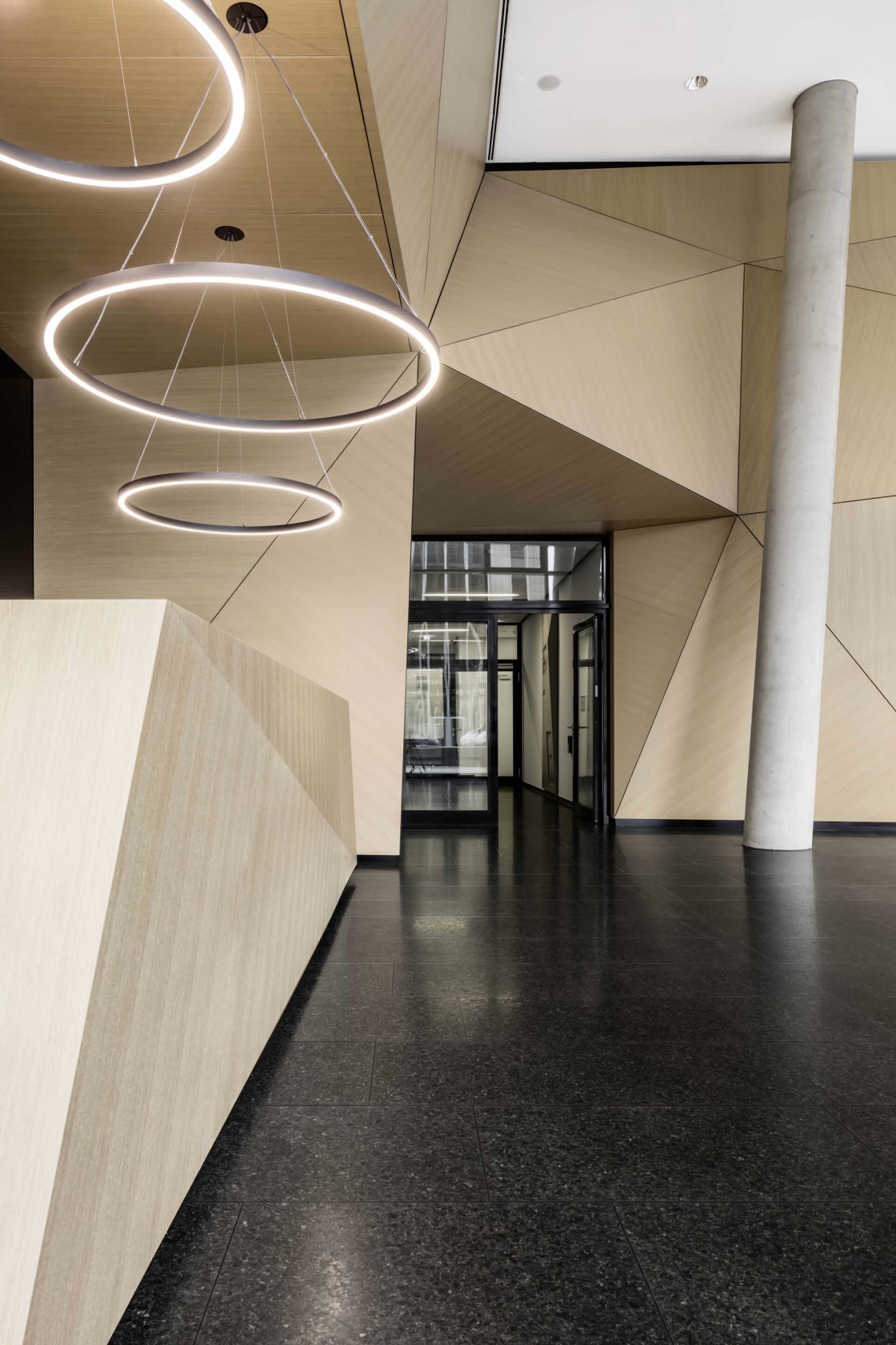 Zur westlich gelegenen Freifläche ist der Baukörper eingeschnitten. So entsteht ein großer, zweigeschossiger Eingangsbereich. Optisch setzt sich der öffentliche Raum innerhalb des Gebäudes durch ein Restaurant und ein Café fort. Auf der Ostseite treppt der Neubau ab. Hier ragt jetzt ein zweigeschossiger gläserner Dachpavillon heraus. Die markante, z-förmige Gebäudesilhouette betonen wir mit breiten Aluminium-Elementen an den Kanten und vertikal gesetzten Lisenen. Im Inneren haben wir hochwertige Räume gestaltet: ein flexibles Bürokonzept mit Platz für 400 Mitarbeiter*innen und Räumen von bis zu 3,50 Metern Höhe.