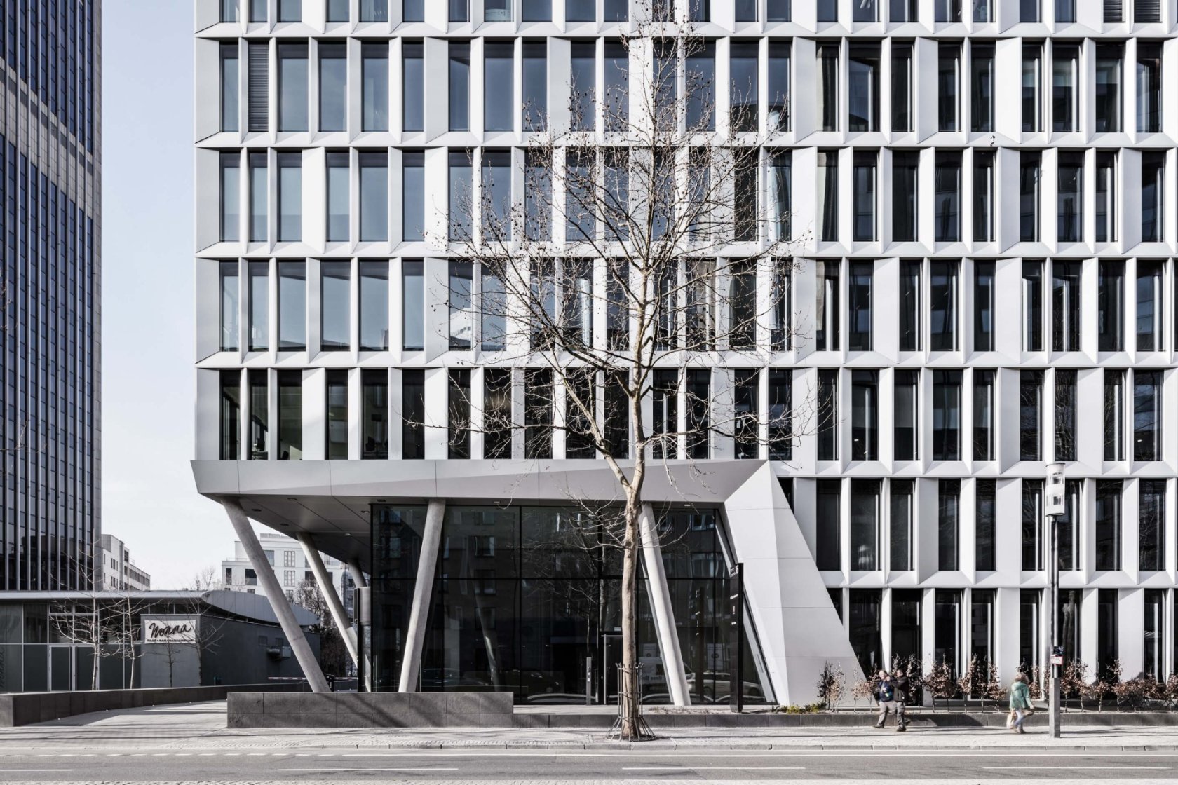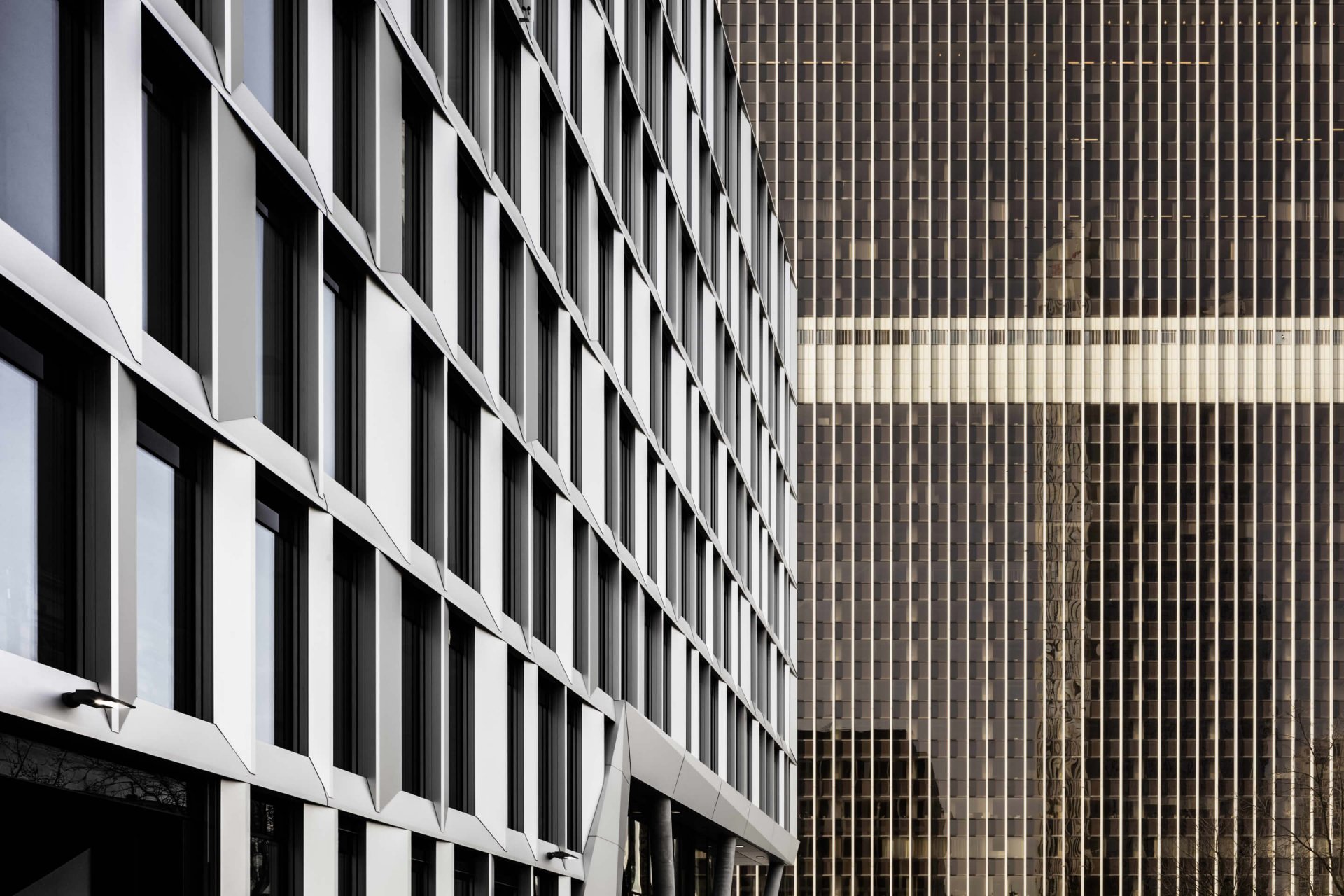 Auf diesem Areal entstand im Jahr 2017 unser Bürogebäude Vista: ein achtgeschossiger Baukörper mit hellsilbern schimmernder Fassade und markanten Gebäudeeinschnitten. Es sollte repräsentativen Charakter ausstrahlen und sich zwischen den großen Nachbarn durch seine Architekturqualität und seine elegante Fassade hervortun. Gleichzeitig wollten wir es funktional effizient gestalten. Das Ergebnis: ein kompakter und durchgliederter Bau, eingefasst in Aluminium und Glas.