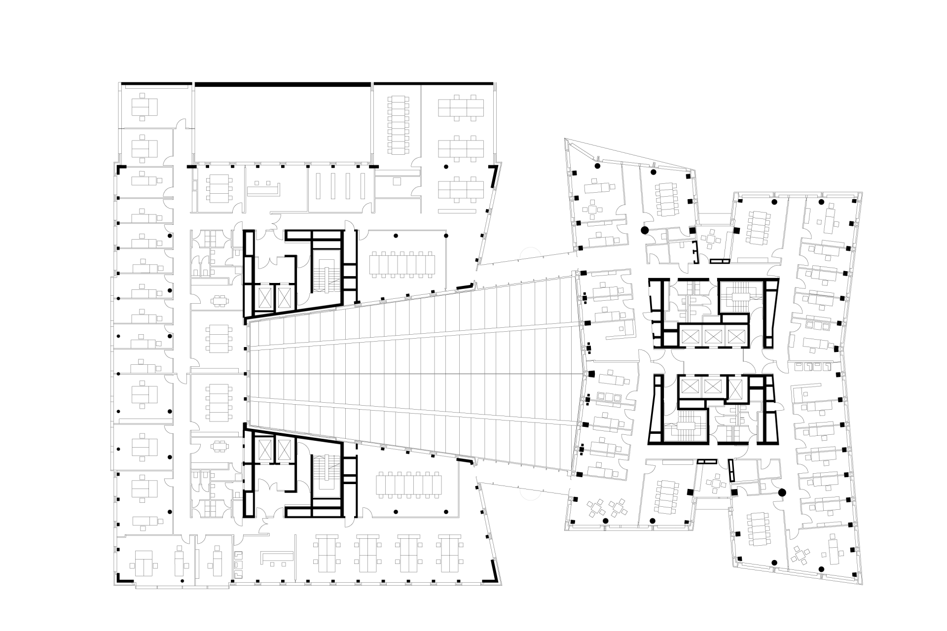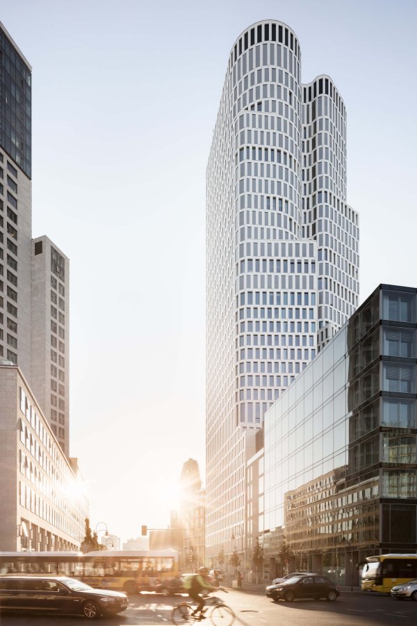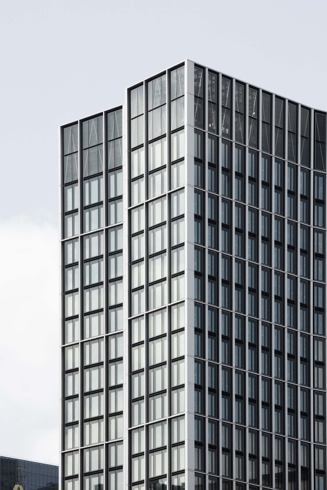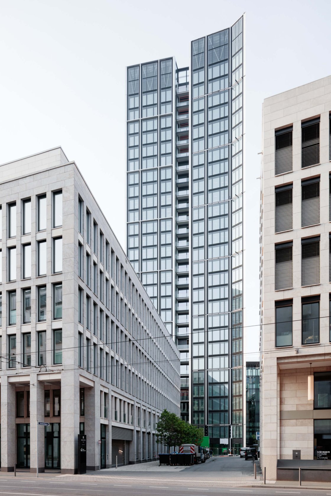 In der Hochhaus-Silhouette markiert der Büroturm WinX das neue Quartier. Mit seinen rund 110 Metern vermittelt er zwischen den niedrigeren Bürobauten in Uferlage und den signifikanten Bankentürmen der Innenstadt. Seine gläserne Aluminiumhaut hebt sich von den sonst dominierenden Natursteinfassaden in der Umgebung ab. Seine Knicklinie in der Längsachse lässt ihn grazil erscheinen. Der x-förmige Grundriss, der ihm seinen Namen verleiht, macht ihn zu einem Turm ohne Rückseite, der über verschiedene Eingänge verfügt – sowohl an der Straßenseite als auch am zentralen Quartiersplatz. So haben wir unser Konzept einer allseitigen Zugänglichkeit des Areals ideal umgesetzt.